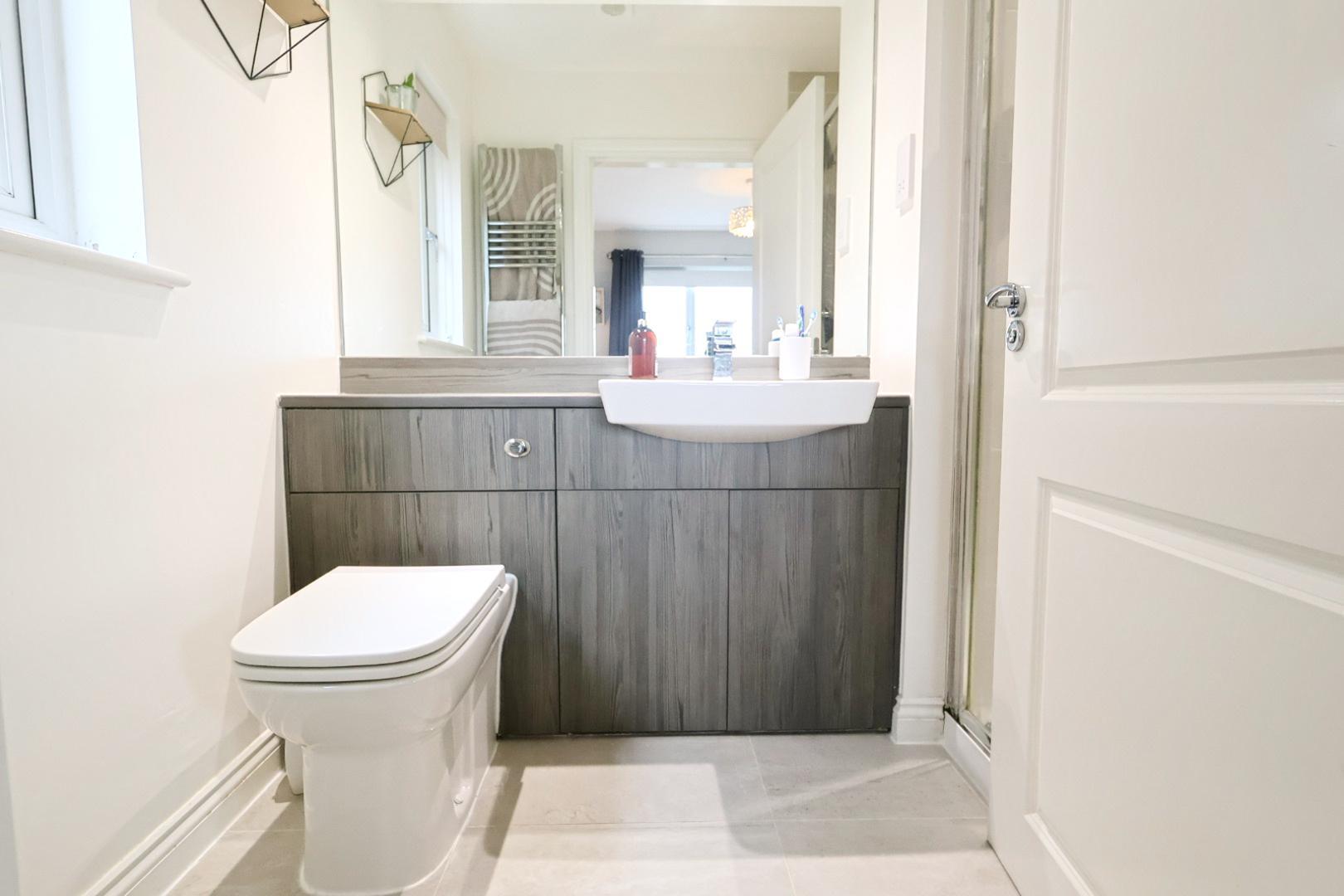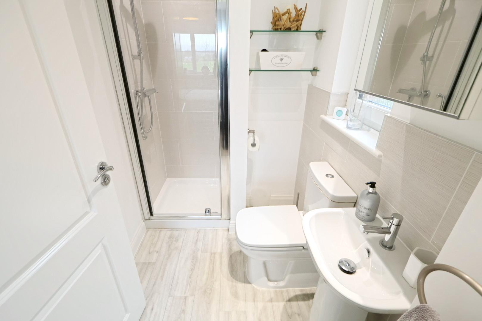 Comprising a double shower enclosure, vanity unit with dual-flush WC and wash-hand basin with mixer tap and mirror above. Ceramic tiled flooring, chrome heated towel rail, opaque rear-facing window, recessed downlights and extractor fan.