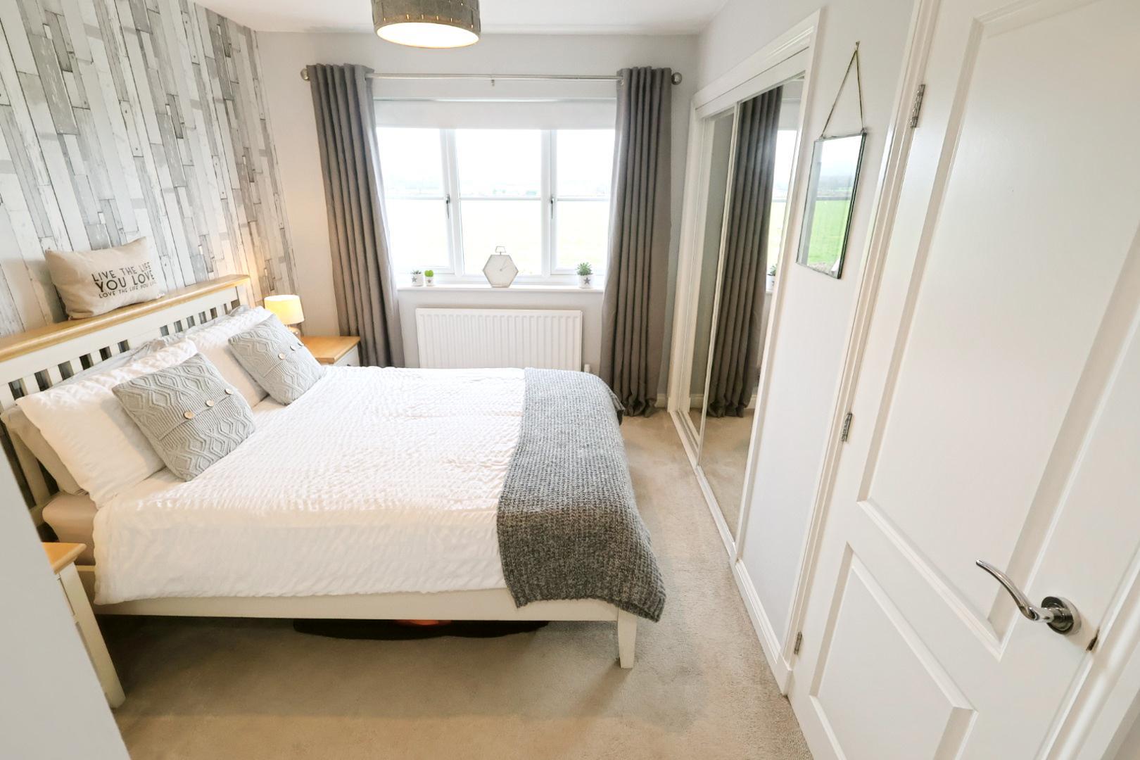 With fitted double wardrobe with mirrored sliding doors, rear-facing window and radiator.