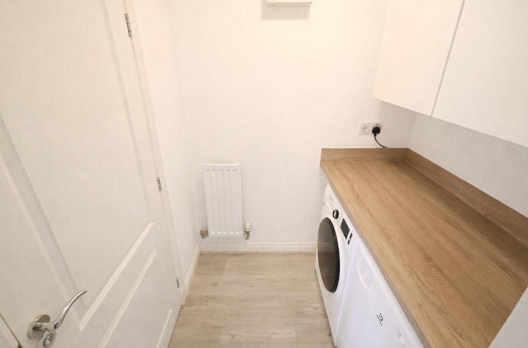 With continuation of the wood-grain effect laminate flooring, radiator, fitted gloss wall units and work surface with space and plumbing for a washing machine and tumble dryer. Door to cloakroom WC.