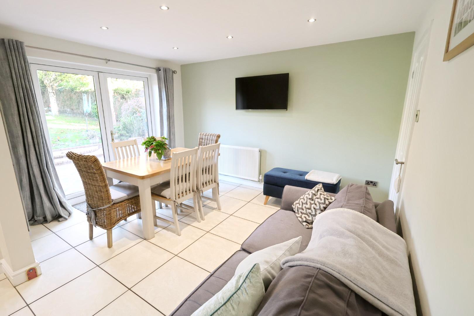 Featuring a continuation of the ceramic tiled flooring from the kitchen, UPVC double-glazed French doors open to the rear garden and brick block patio area. There is a radiator, a stainless steel tower column radiator, and recessed ceiling downlights.