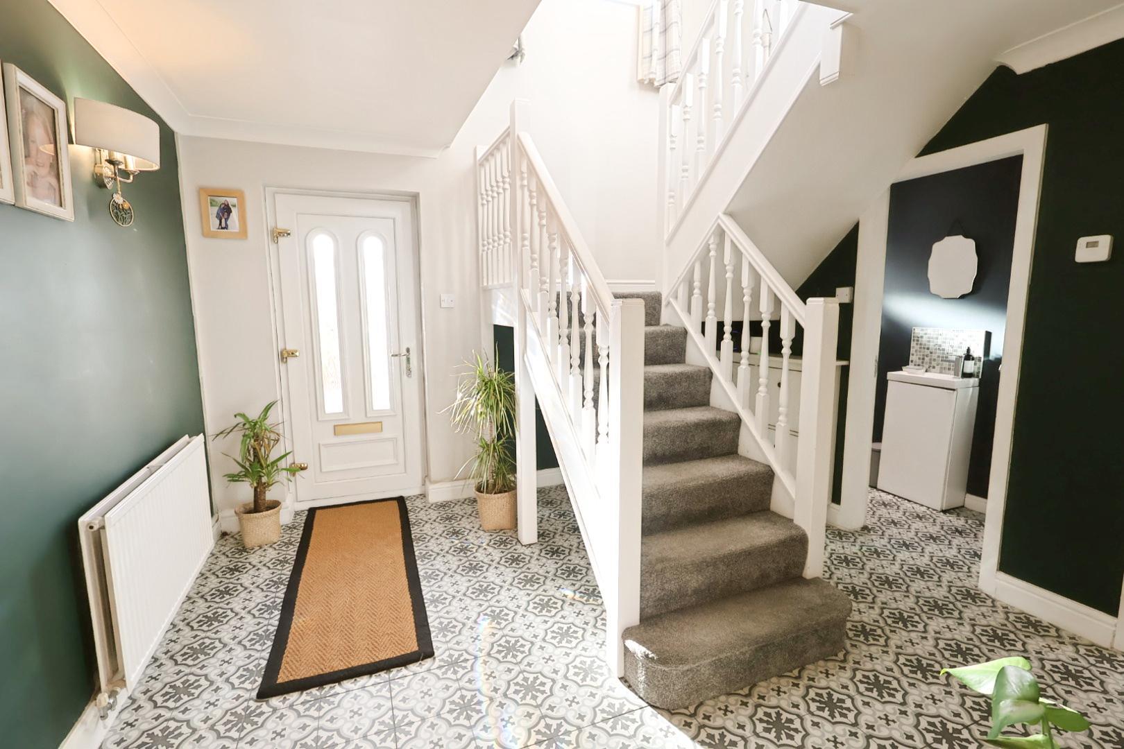 An opaque UPVC double-glazed entrance door opens to a spacious and inviting entrance hall with patterned tiled flooring, a radiator, and a turned staircase with banister and spindle balustrades rising to the first-floor accommodation. Internal doors open to the kitchen, dining room, and living room.
