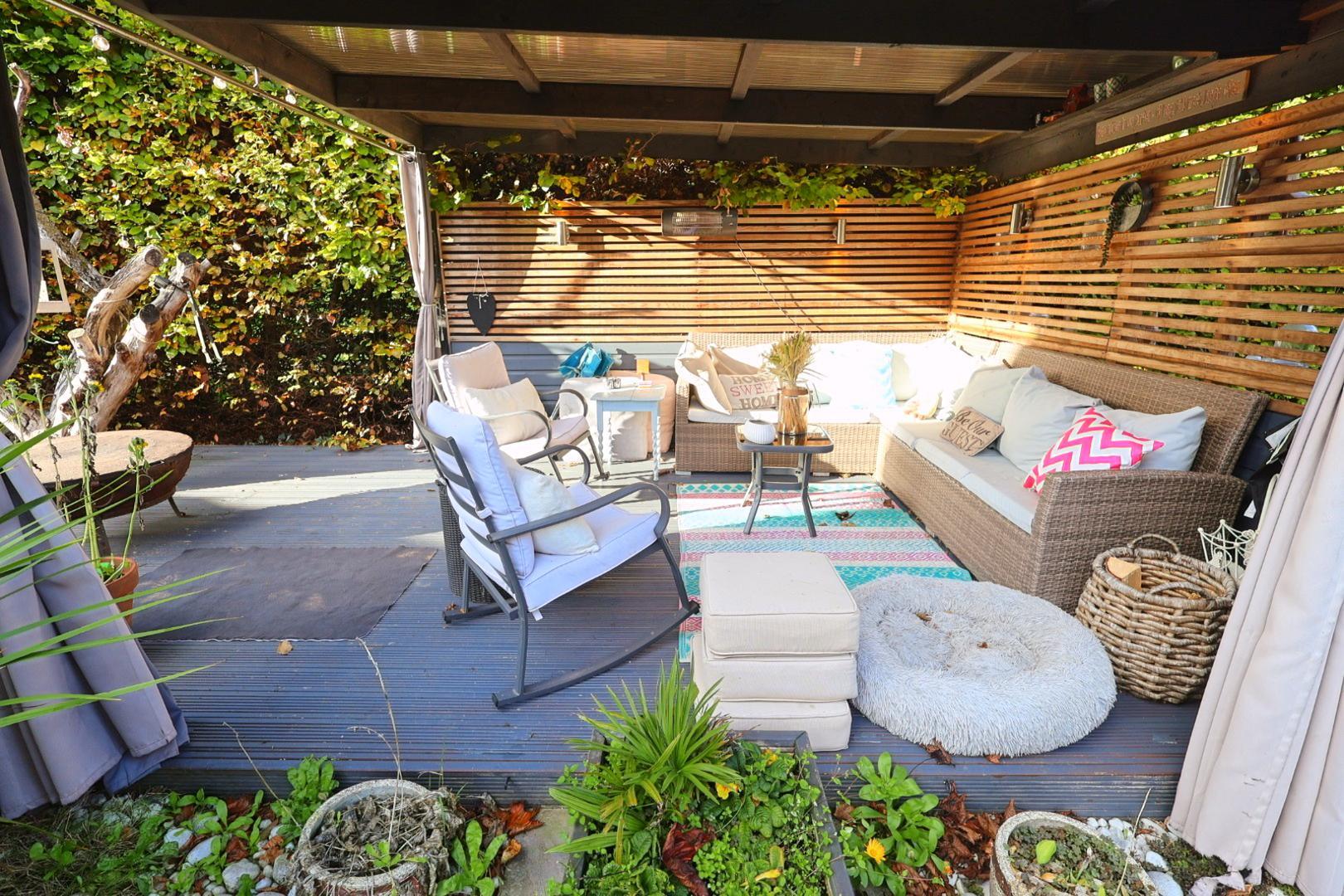 A white farmhouse gate opens onto a gravel off-road parking area with brick block borders, dividing an attractive lawn and shrub garden enclosed by hedge borders. This leads to a further brick block seating area. A brick block pathway to the side provides access to the rear garden through a timber gate. In front of the main entrance door is an open canopy porch with ceramic tiled flooring, an external light, a power point, and an electric vehicle charging point. Accessed via a timber side gate, the generous rear garden is beautifully presented with brick block walkways, patterned patio areas, and external lighting. Additional features include hot and cold water supplies, a covered decked seating area, and a predominantly lawned garden interspersed with mature plants, shrubs, and trees, all enclosed by hedging.