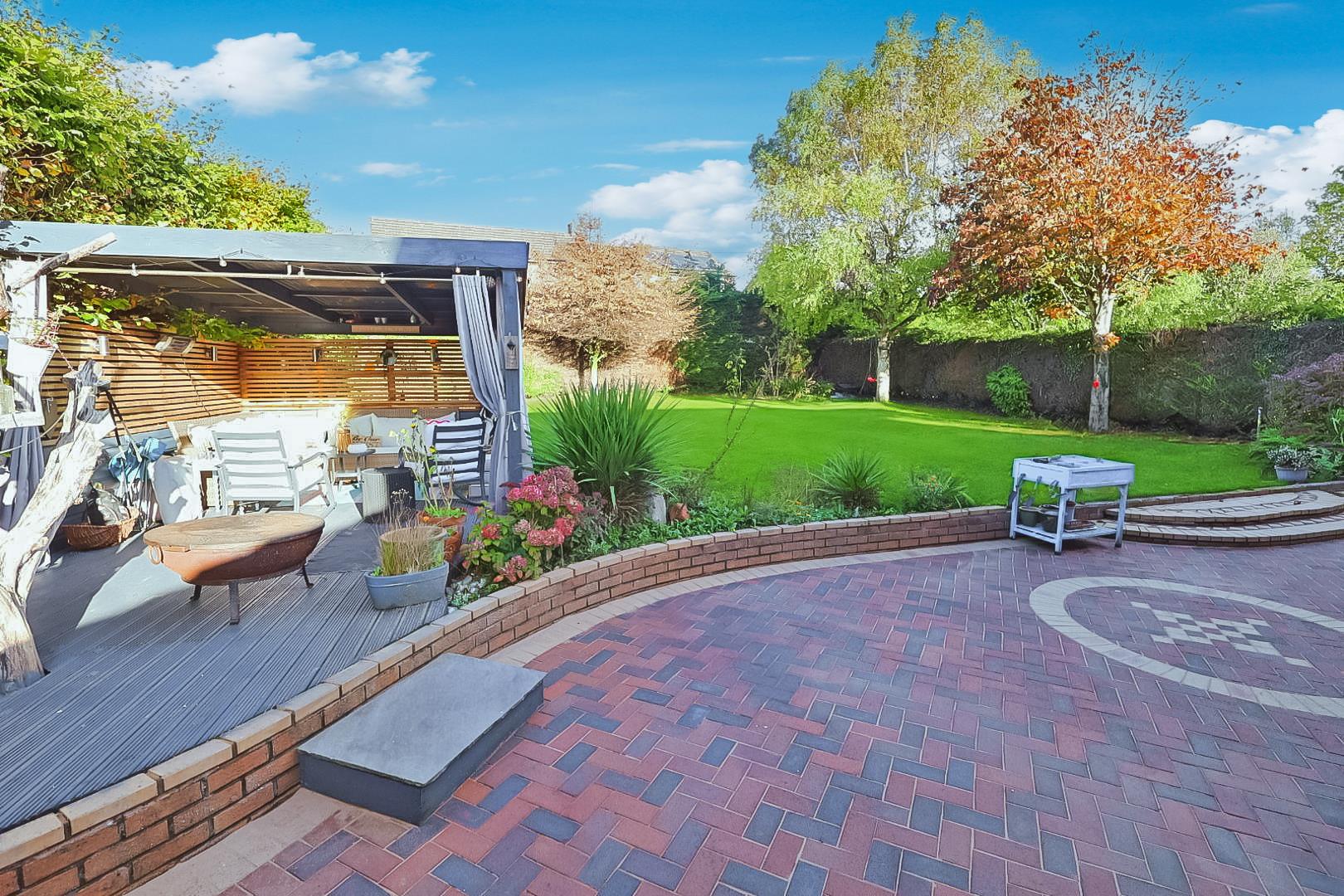 Externally, the home boasts a generous plot with attractive front gardens, extensive parking, and a beautifully landscaped rear garden with covered seating area.