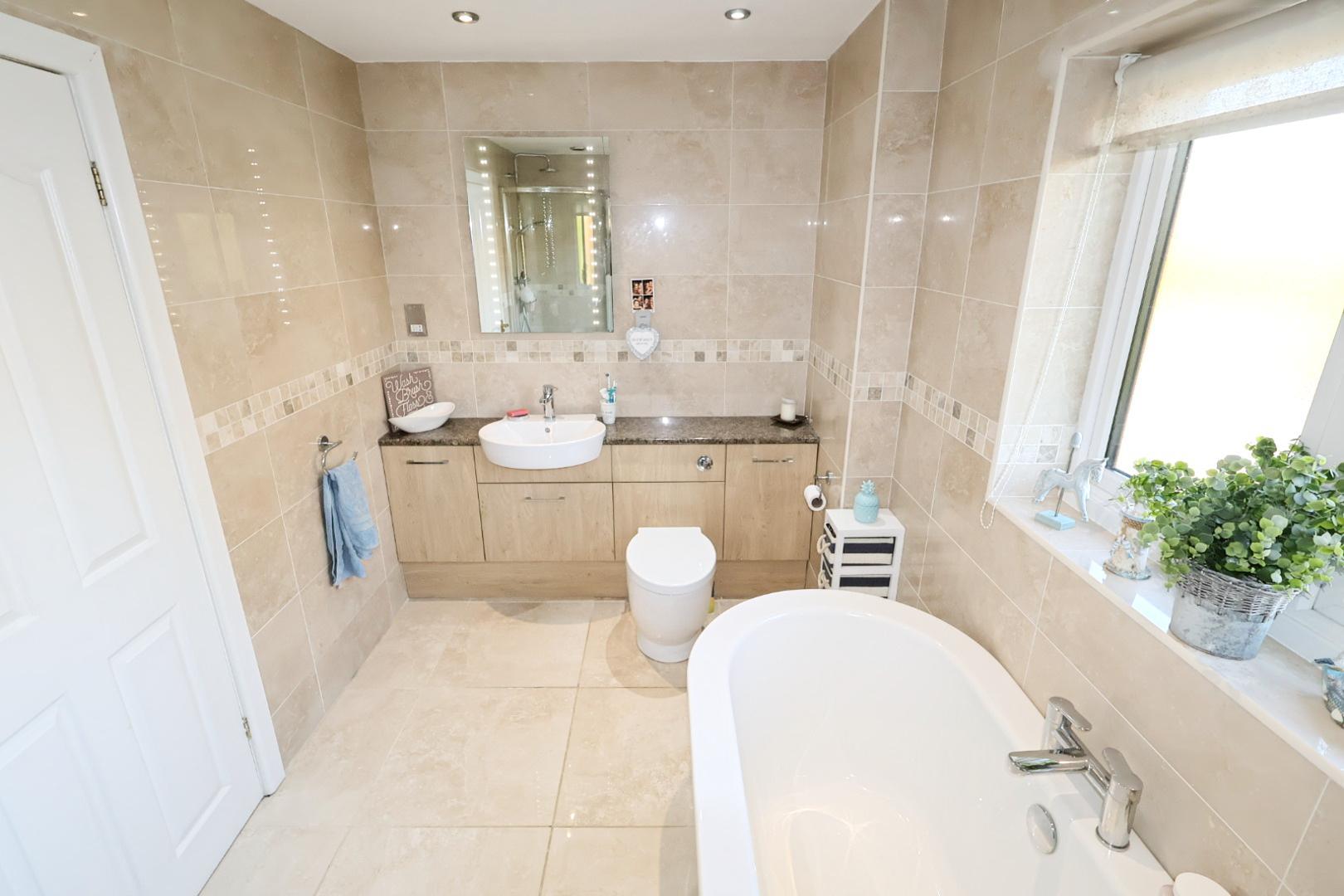 Fully tiled walls, ceramic tiled flooring, opaque rear window, chrome heated towel rail, recessed downlights, and extractor fan.