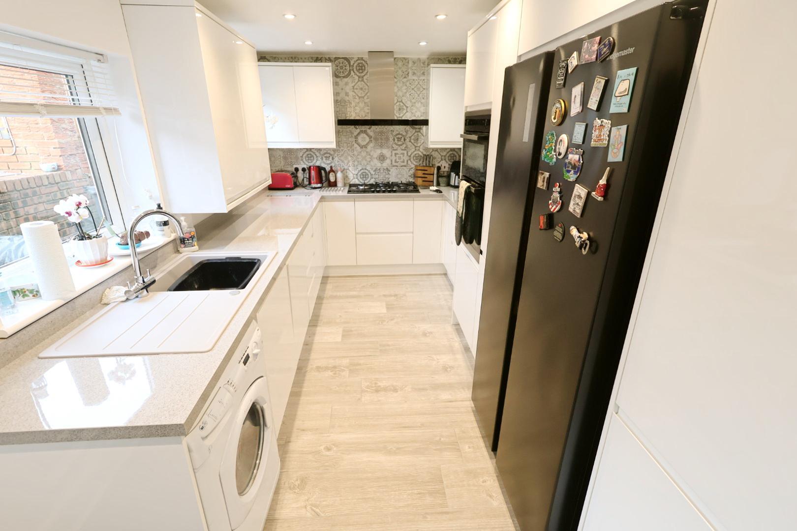 Fitted with wood grain-effect ceramic tiled flooring, a contemporary column-style radiator, and recessed ceiling downlights. Two windows face the side elevation, along with an opaque UPVC double-glazed rear door. The kitchen is fitted with an array of attractive modern white gloss fronted wall, base, and drawer units with work surfaces, housing a resin single drainer sink with mixer tap, a cupboard for the gas boiler, and integrated appliances including a stainless steel double oven, five-ring gas hob with extractor hood above, and a dishwasher. There is also space and plumbing for a washing machine.