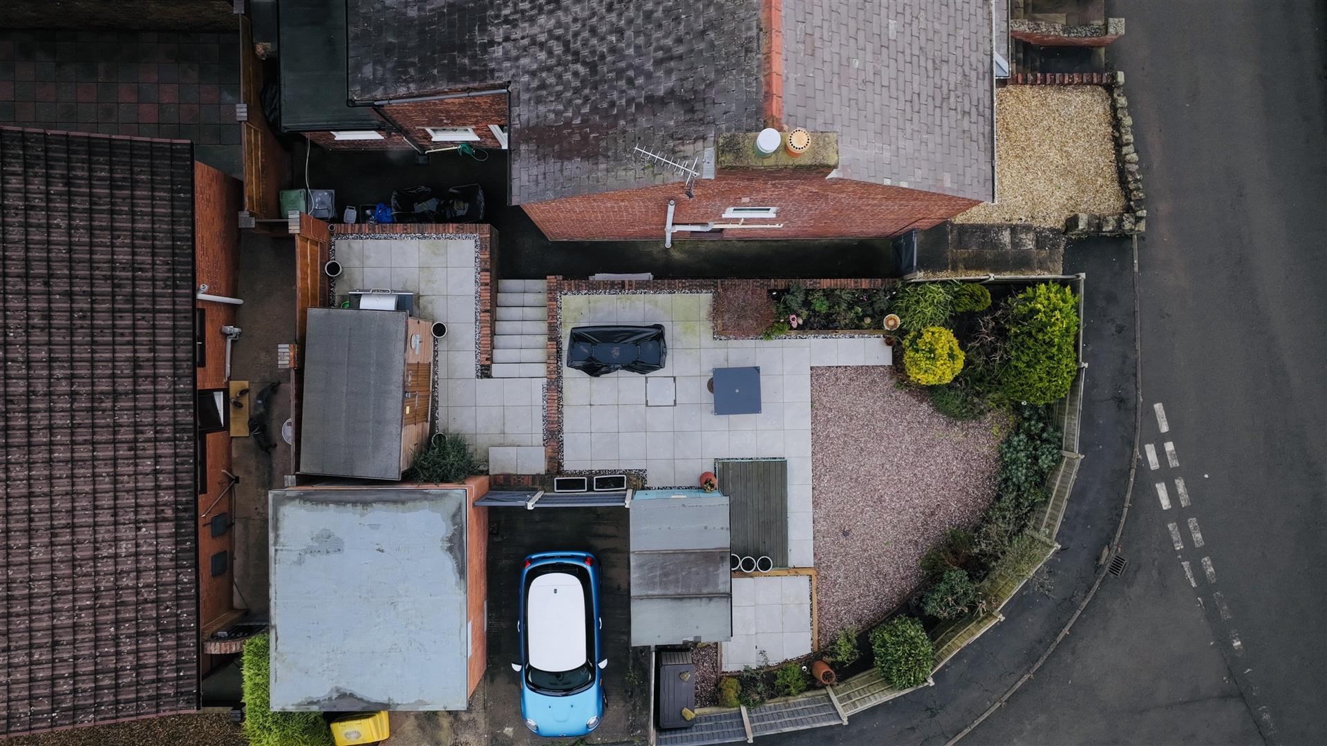 Directly to the front of the property is a golden gravel garden with a paved pathway and steps rising to the front door. A timber-gated side access leads to the side and rear garden which are landscaped to provide a low-maintenance outdoor space, the garden is predominantly paved and gravelled and enjoys views towards the front over the hills and fields. The garden is well stocked with a variety of plants and shrubs and includes two timber sheds, an outside light and water supply, and timber-gated access leading to the property’s off-road parking space.