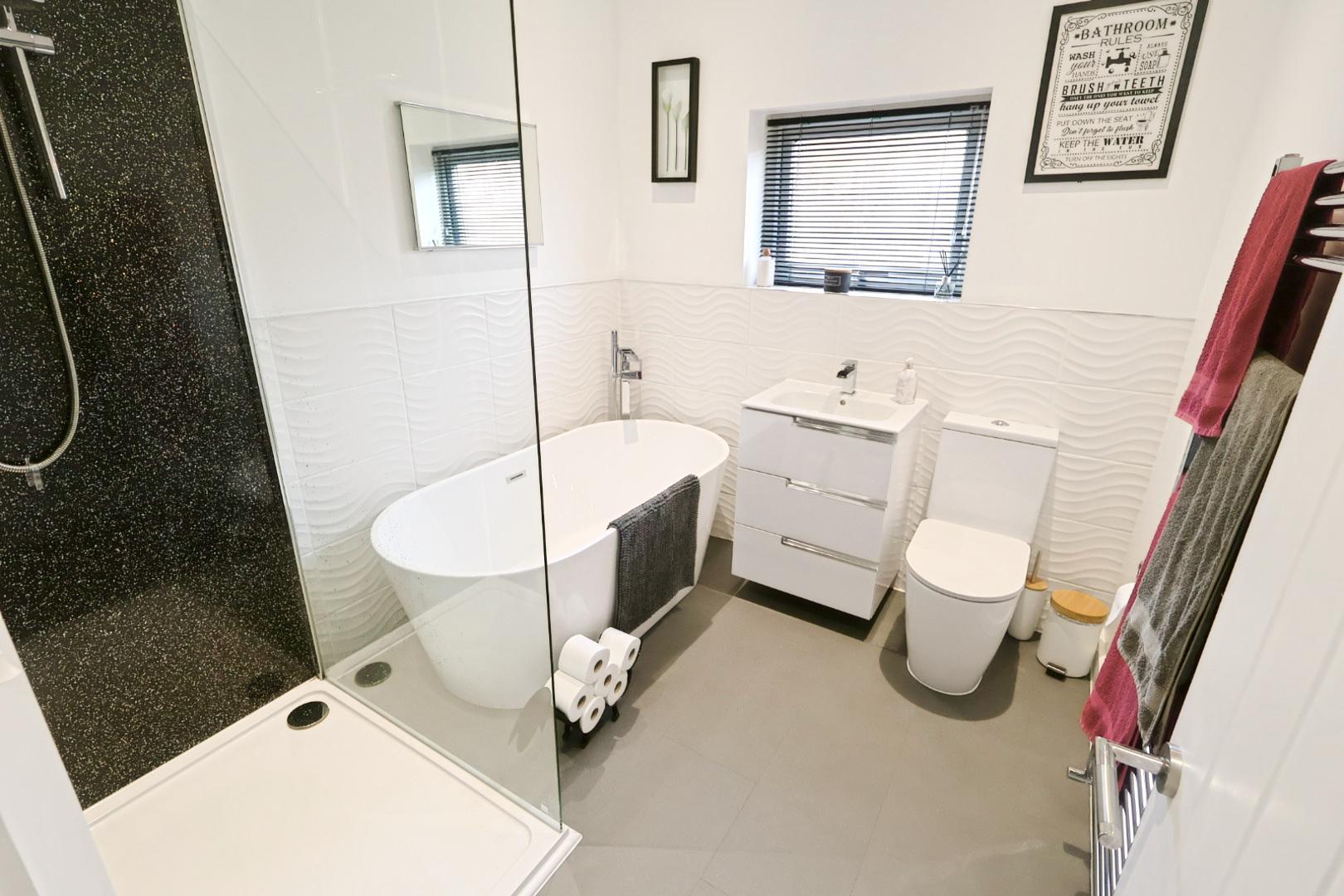 Installed with a contemporary white four-piece suite comprising a standalone bath with waterfall-style mixer tap and handheld shower attachment, an oversized shower enclosure with electric shower, protective glass screen and panelled walls, a vanity unit with waterfall-style mixer tap, and a dual-flush low-level WC. The walls are partially tiled and complemented by a chrome heated towel rail, an opaque window to the side elevation, recessed ceiling downlights, and an extractor fan.