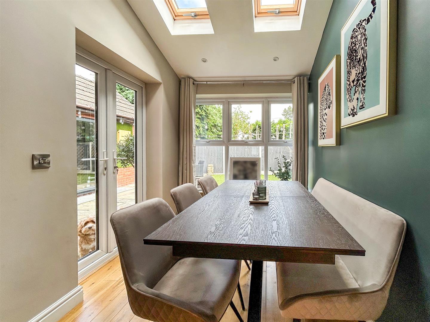 The extended dining room has a lovely vaulted ceiling, window to the rear, spotlighting, two roof lights and French doors opening onto the rear garden.
