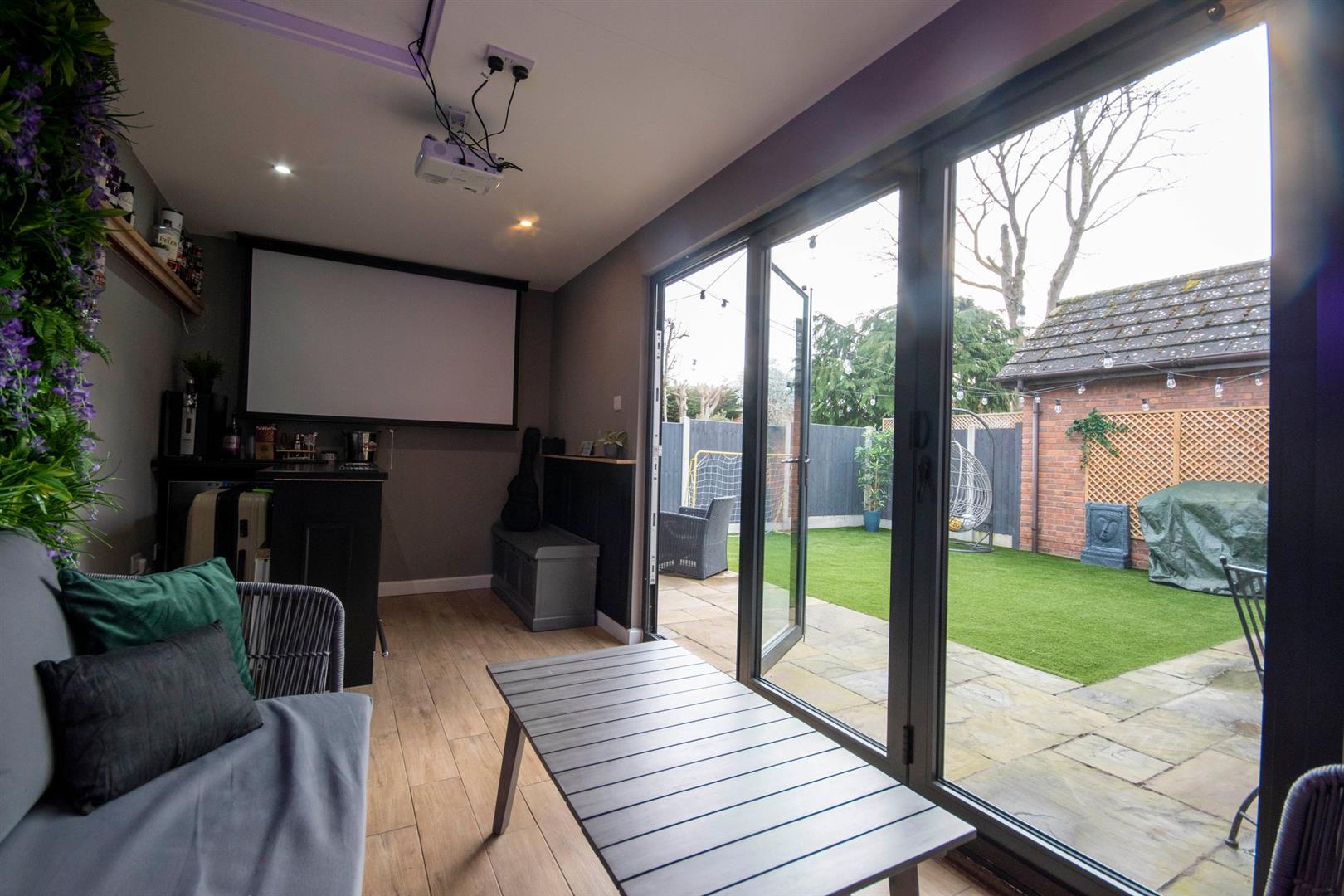 The studio/ office has recently been completed and offers a versatile space for either home working/ hobbies or for entertaining having a feature bar, changeable lighting and power points. Having doors opening onto the garden, the space can be used all year round.