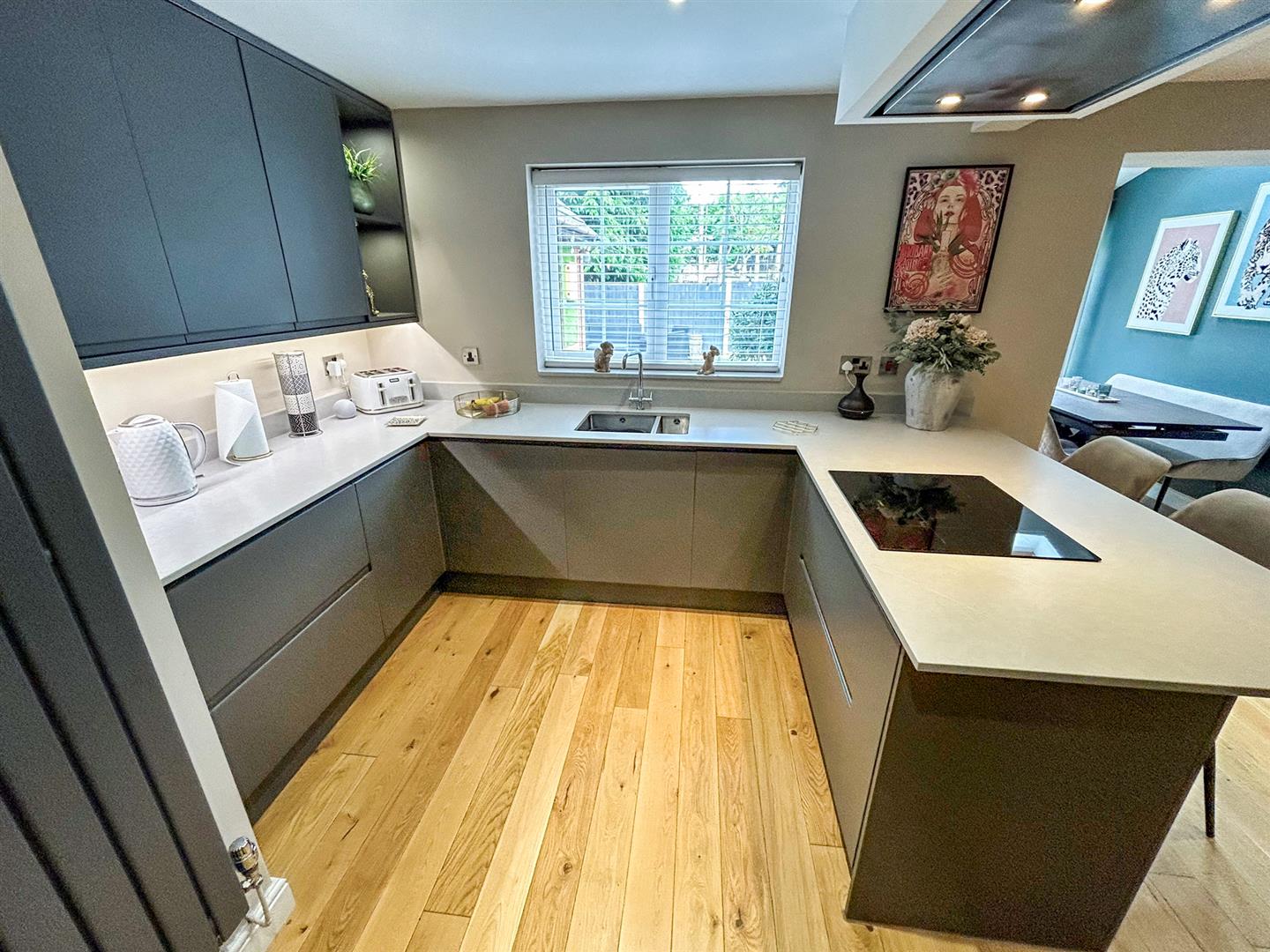 The impressive kitchen/ breakfast room has recently been refitted with contemporary base and wall units with contrasting work surfaces over, one and a half bowl inset sink with a mixer tap over, integrated fridge, integrated freezer, integrated dishwasher, induction hob with an integrated ceiling extractor fan over, two eye level electric ovens, spotlighting, vertical radiator, larder units, wood flooring and soft close drawers and doors. The kitchen leads through to the dining room and a doorway leads to the utility.