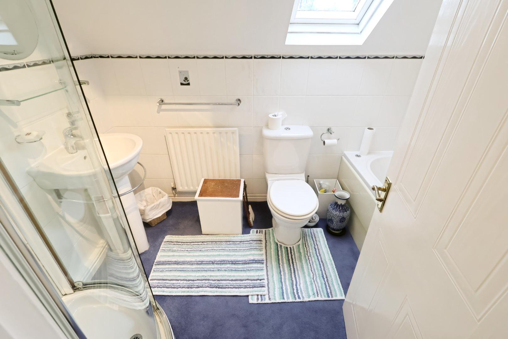 Installed with a white four-piece suite comprising a spa bath, corner shower enclosure with dual-head thermostatic shower, dual-flush low-level WC, and pedestal wash hand basin. The walls are partially tiled, there is a radiator, and a double-glazed skylight is set within the ceiling.