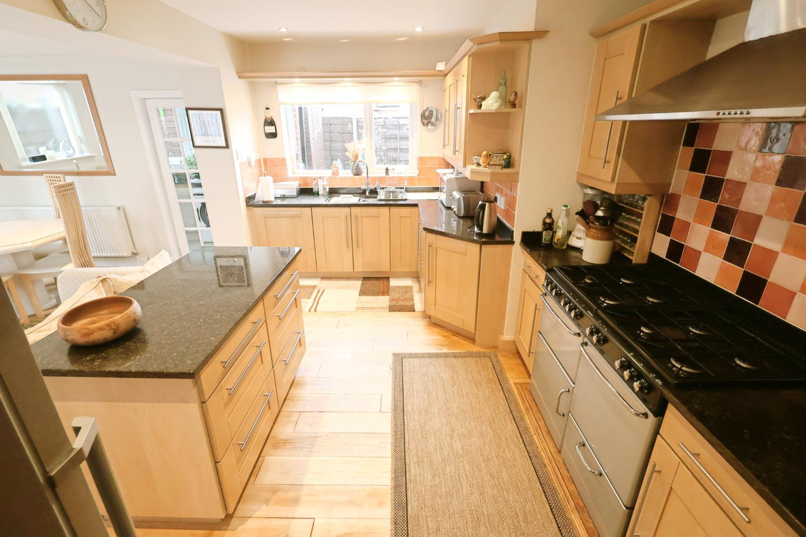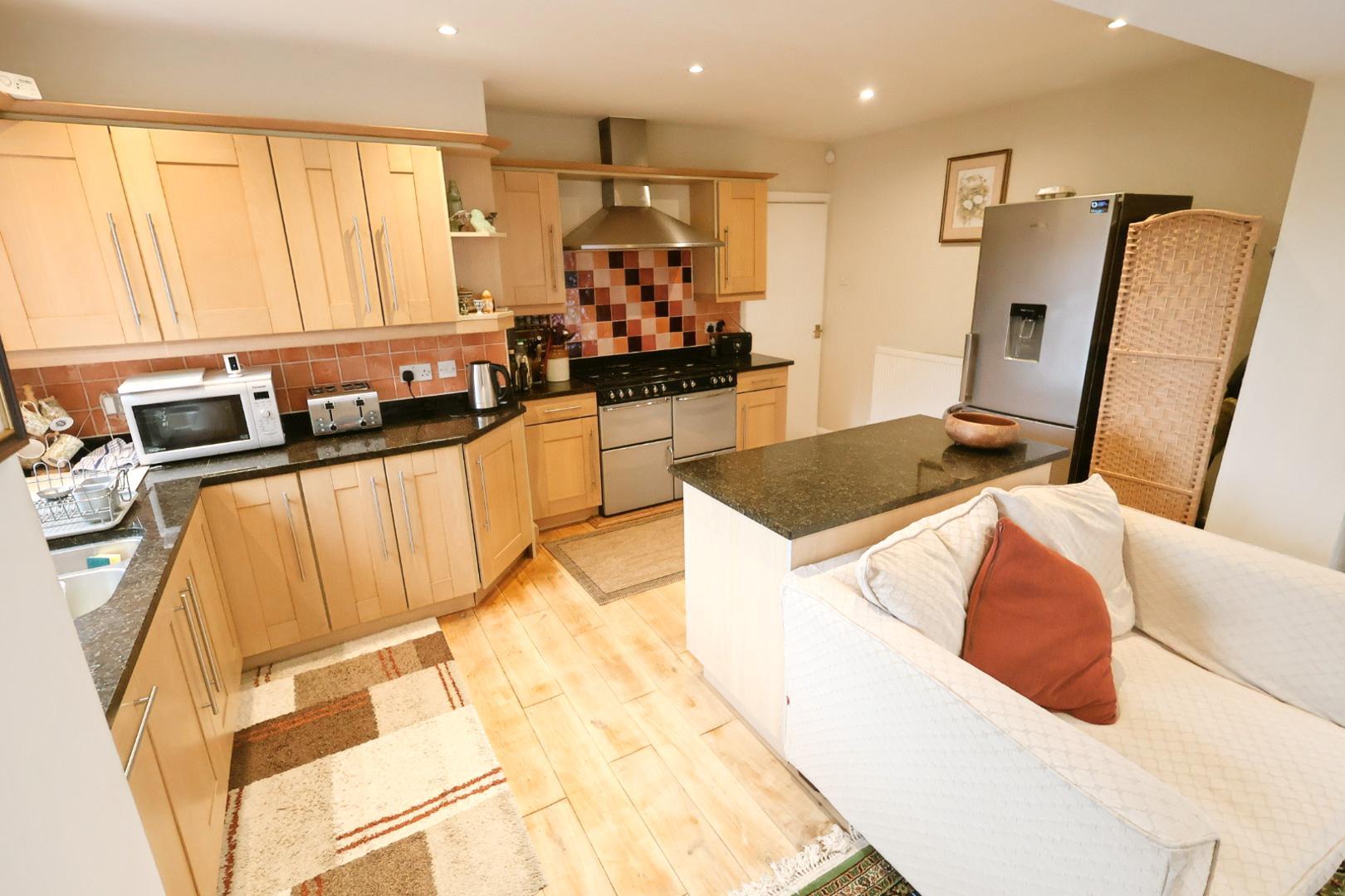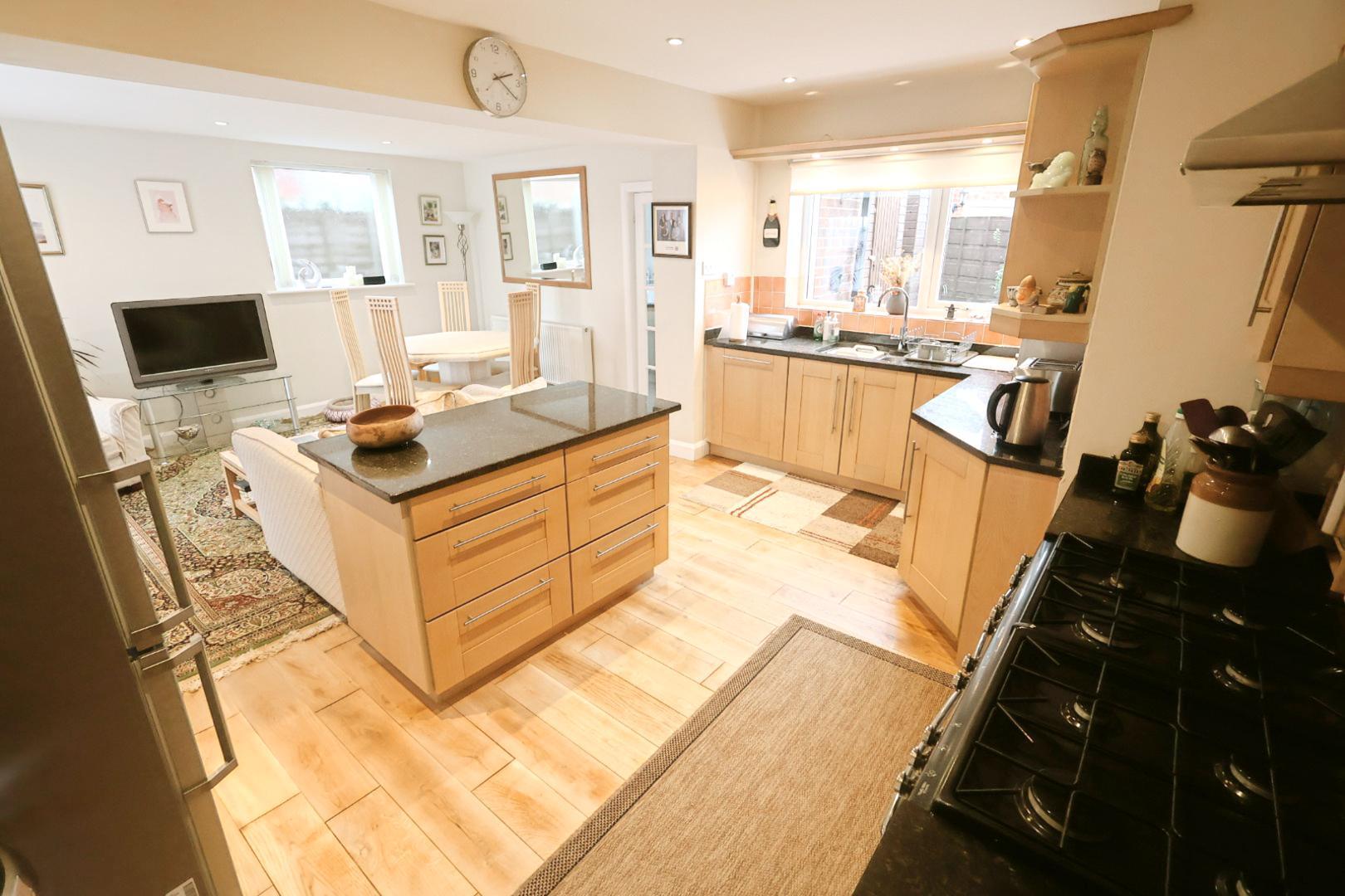Featuring light oak flooring throughout, two radiators, a UPVC double-glazed patio door opening to the front garden, an opaque window to the side, and a window to the rear elevation. A glazed door leads to the utility room. The kitchen area is fitted with a range of attractive light wood-grain-effect wall, base, and drawer units complemented by stainless steel handles, along with an island unit and granite work surfaces throughout. It incorporates a stainless steel one-and-a-half bowl sink unit with mixer tap and tiled splashback. There is space for a range cooker with a stainless steel extractor hood above, an integrated dishwasher, and recessed downlights throughout.