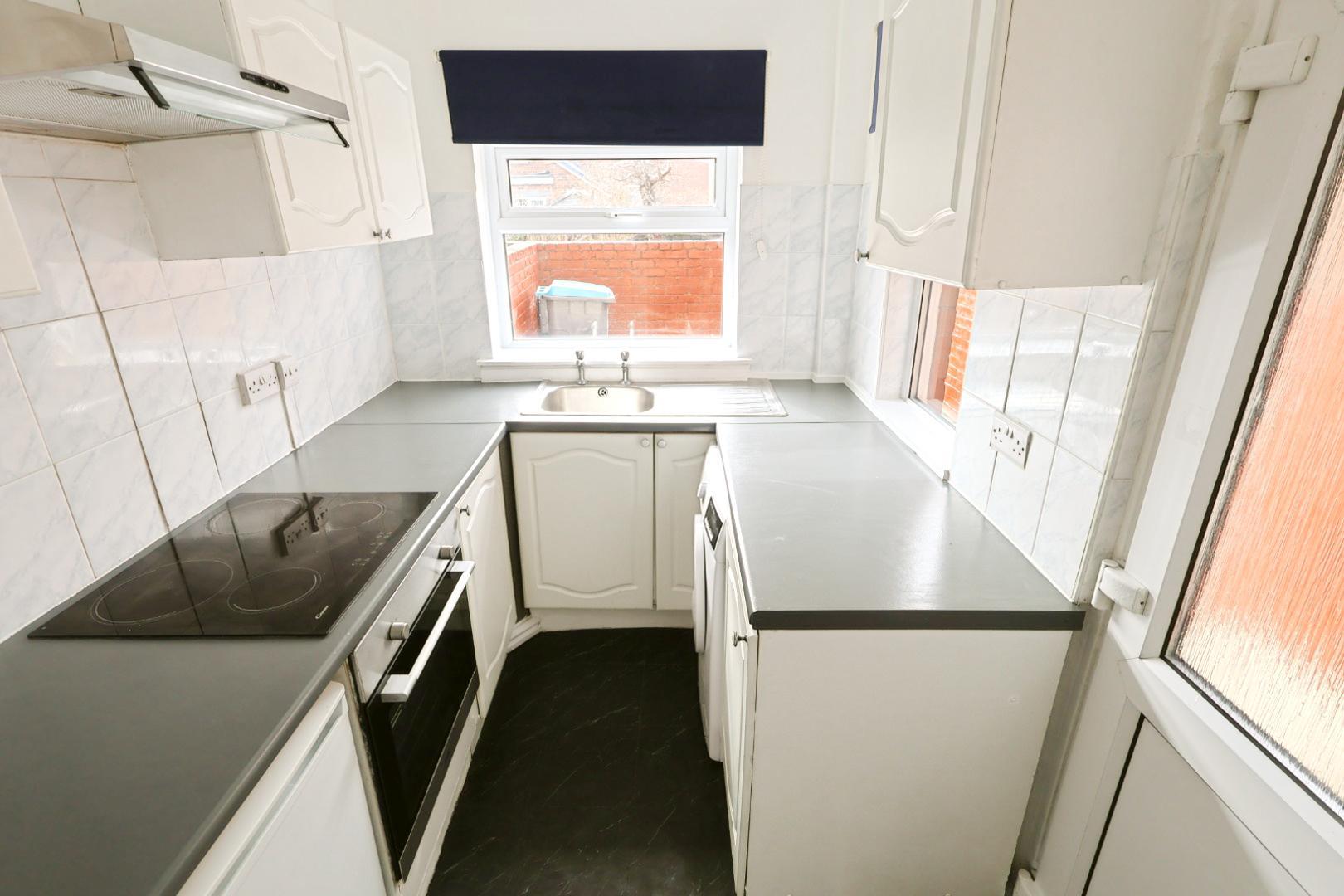 The kitchen is fitted with white wall and base units, complemented by work surfaces housing a stainless steel single drainer sink with tile splashback. There is a built-in stainless steel oven, hob, and extractor hood. Windows face both the rear and side elevations, and an opaque UPVC double-glazed door opens onto the rear courtyard.