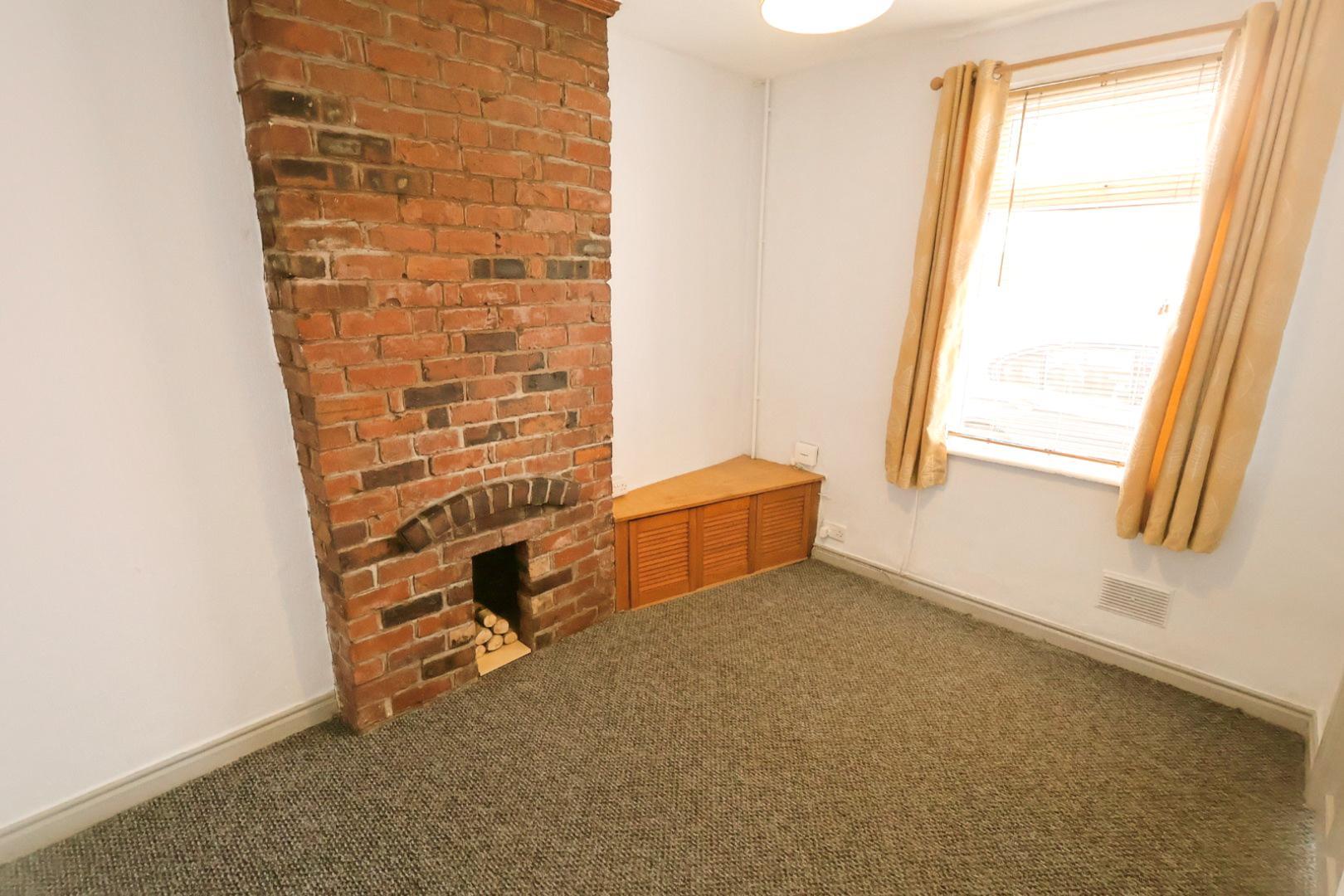 The lounge features an ornamental exposed brick fireplace, a radiator, and a window overlooking the front elevation.