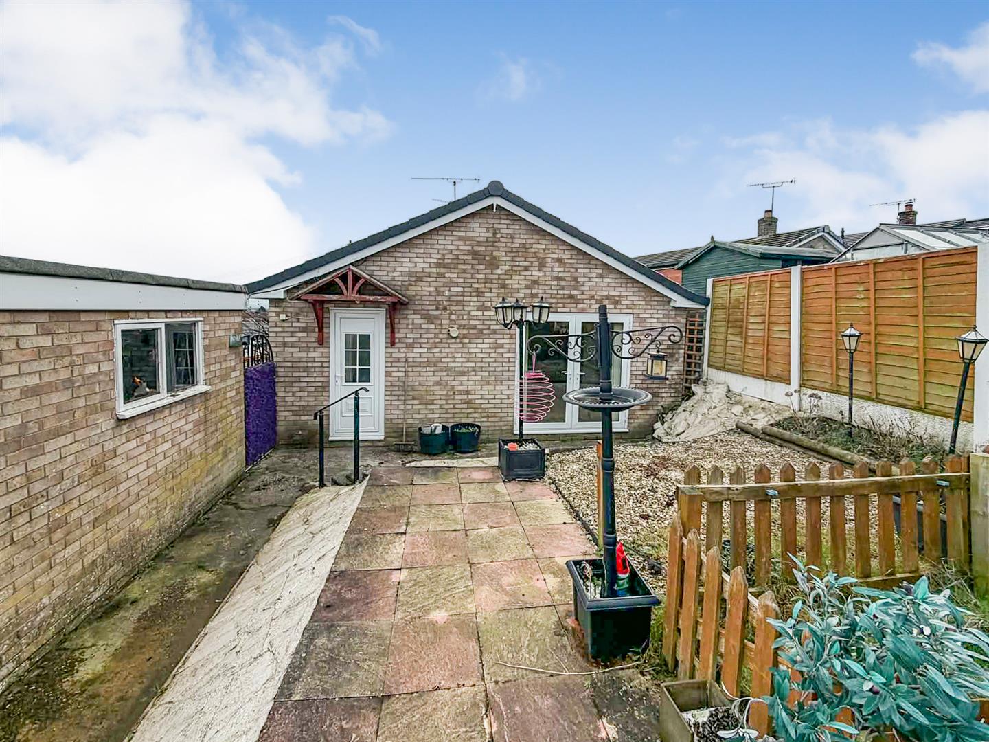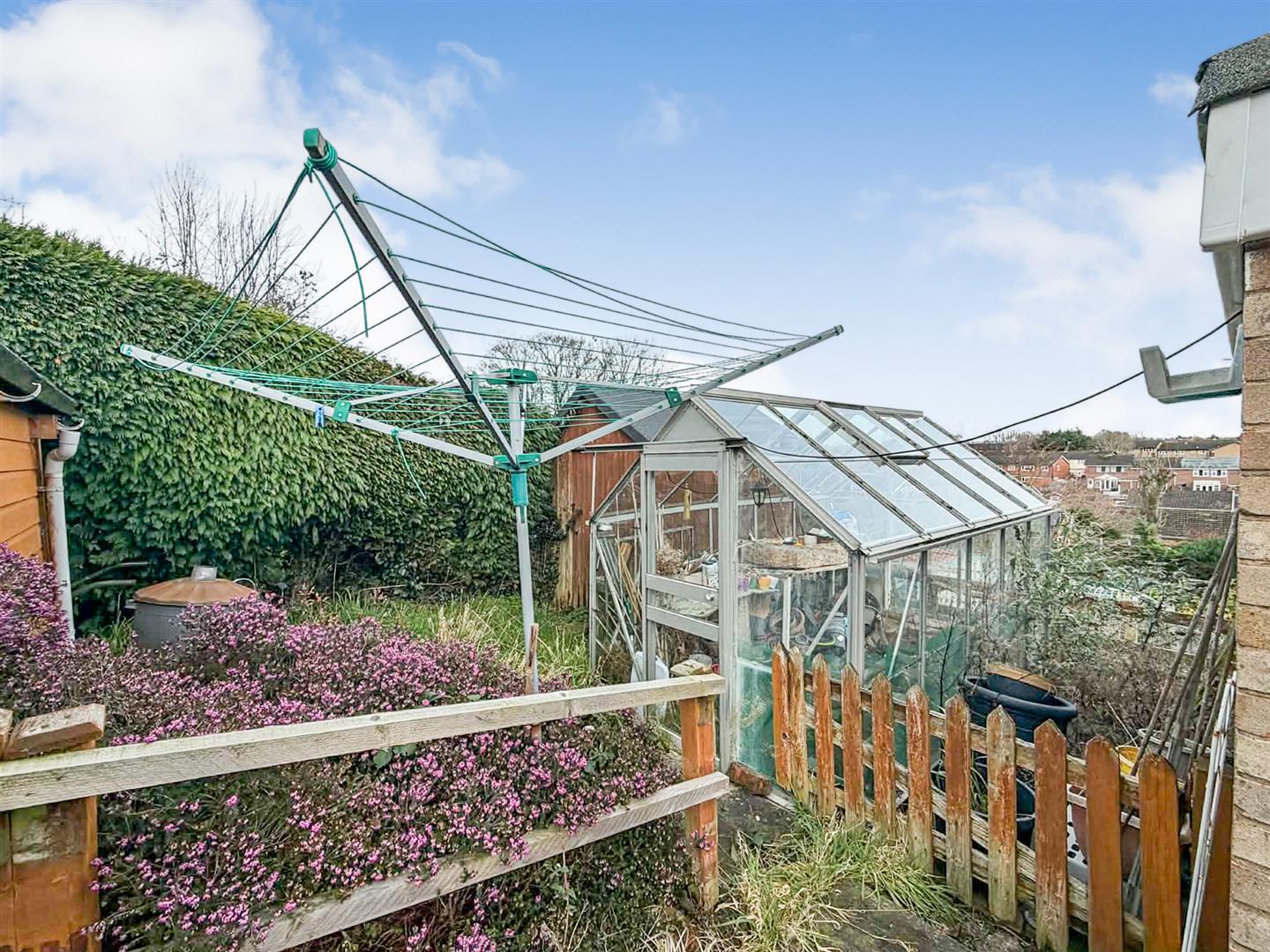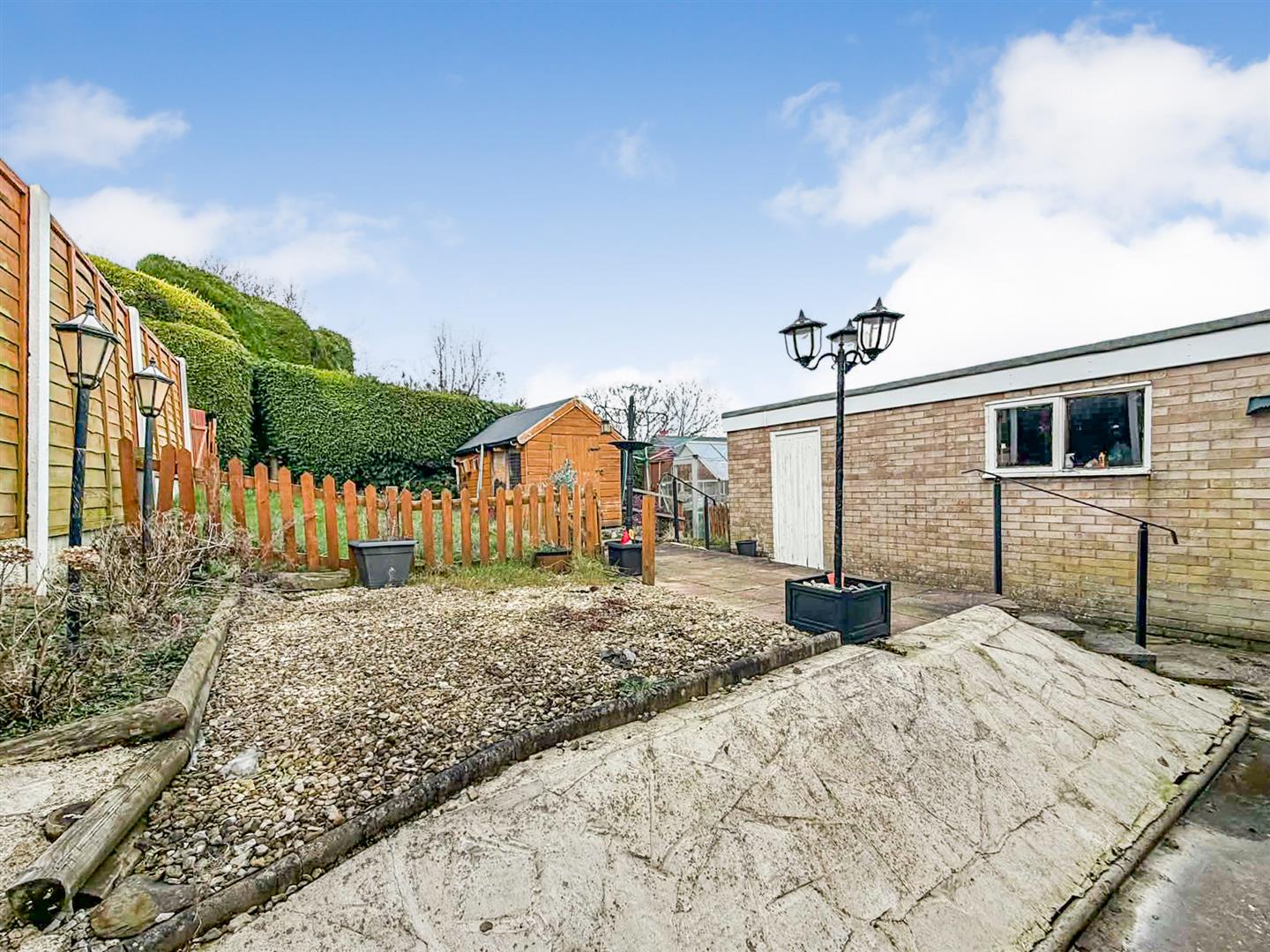 The enclosed rear garden is on two levels, the lower level is concreted, with steps that lead up to a gravelled area and a further enclosed lawned garden. Enclosed by hedging and fencing, there are two sheds and a greenhouse. A path leads to the side of the property.