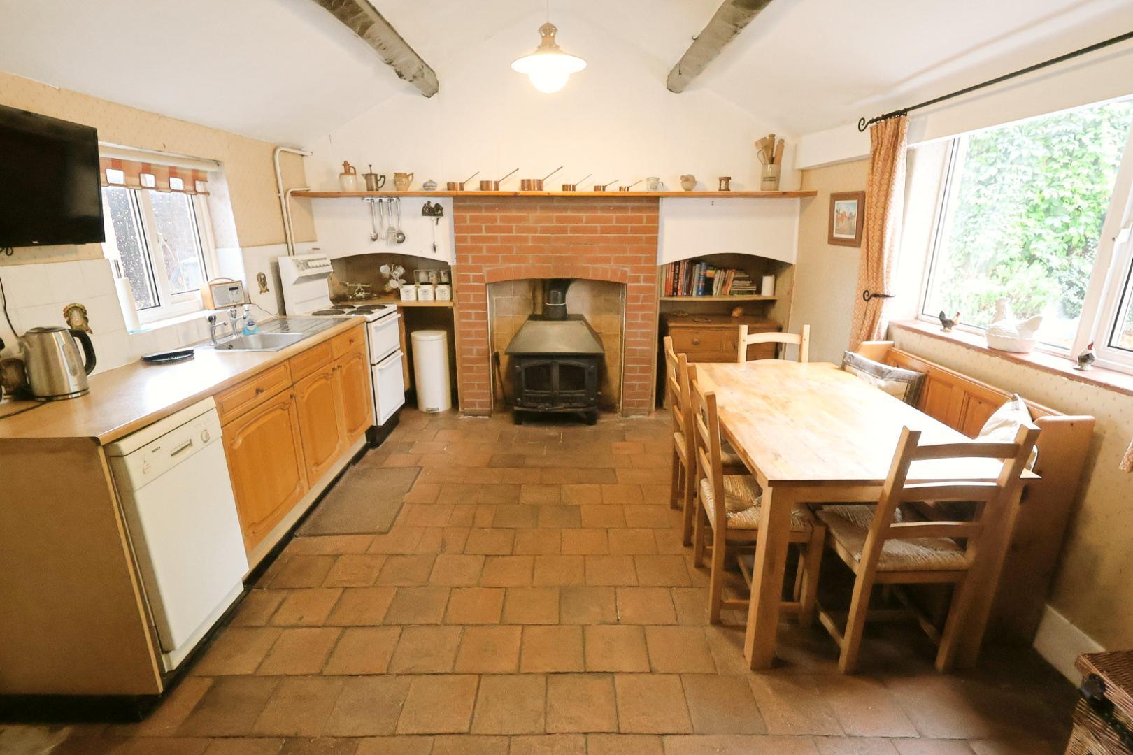 Laid with quarry tile flooring throughout, the kitchen has UPVC double-glazed windows to both front and rear elevations. It features a vaulted ceiling with exposed beams and a range of light oak-style base units with work surfaces. A stainless steel single drainer sink is set against tiled splashbacks, and an ornamental cast-iron solid fuel burner sits within an exposed brick flue. A timber panel door opens to the walk-in pantry, and another door leads to the rear hallway.