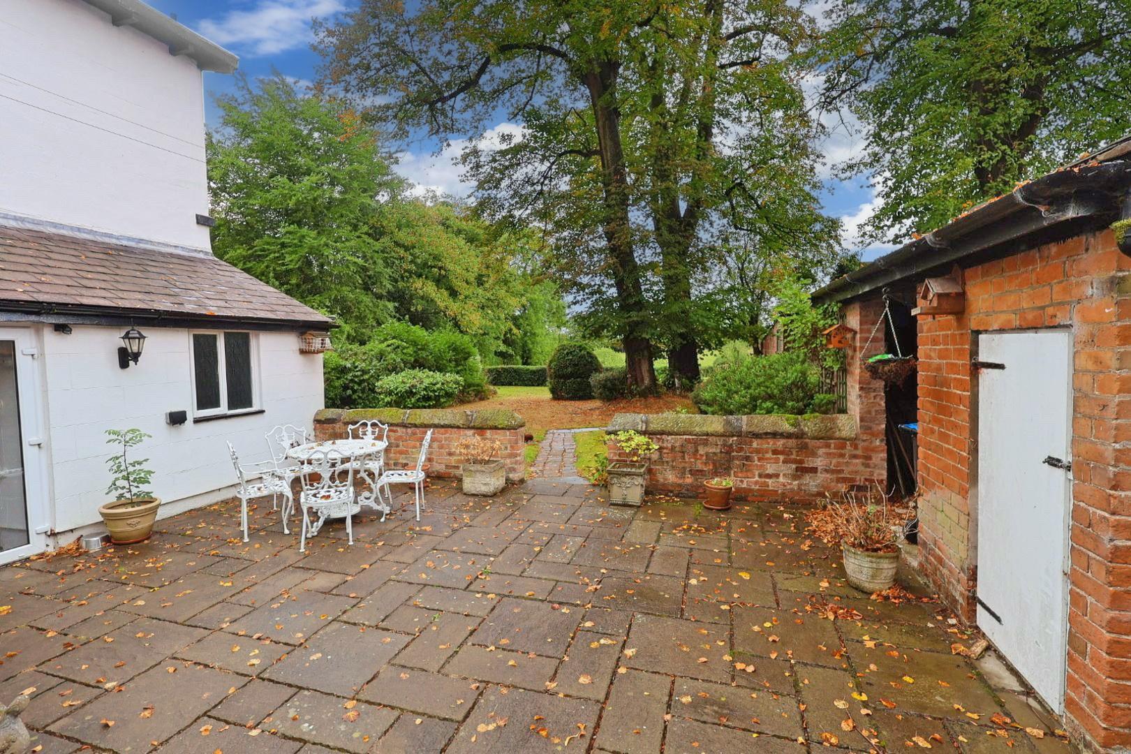 The property is approached via a long driveway, which winds through generously proportioned woodland gardens and leads to ample off-road parking and a turning area positioned in front of the garage. A paved patio area runs along the right-hand side of the property, providing access to the rear gardens, outbuildings, and re-entry to the garage.