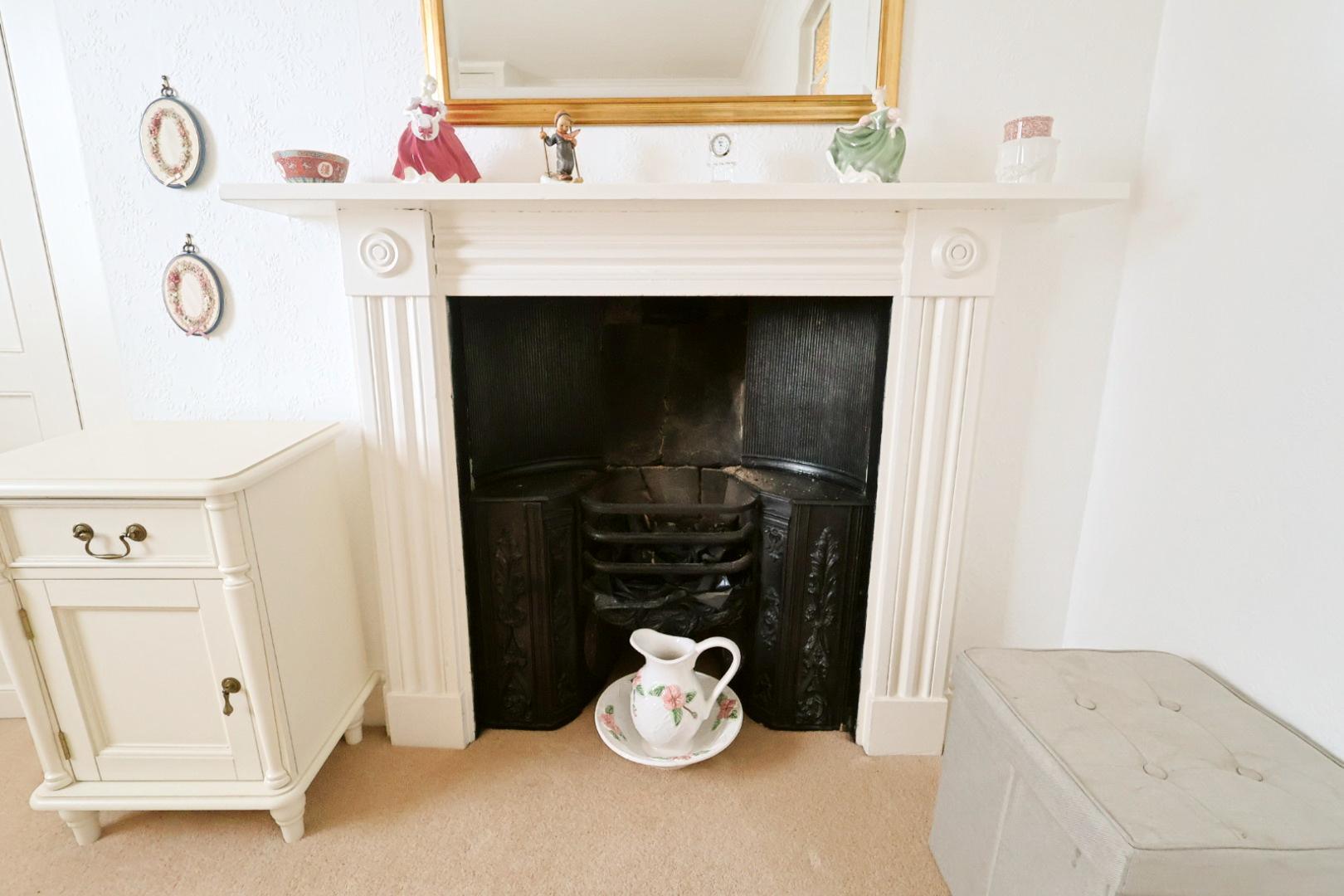 With a sash window to the side elevation, radiator, fitted airing cupboard (shelved for linen storage), built-in wardrobe, and a charming cast-iron fireplace with an ornate surround.