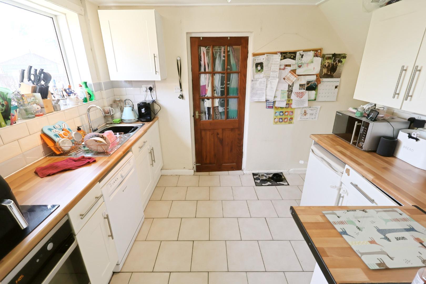 Fitted with shaker-style wall, base and drawer units, work surfaces, stainless steel one-and-a-half bowl sink unit with mixer tap, integrated oven, hob and extractor hood, space and plumbing for appliances, window to rear and door to utility room.