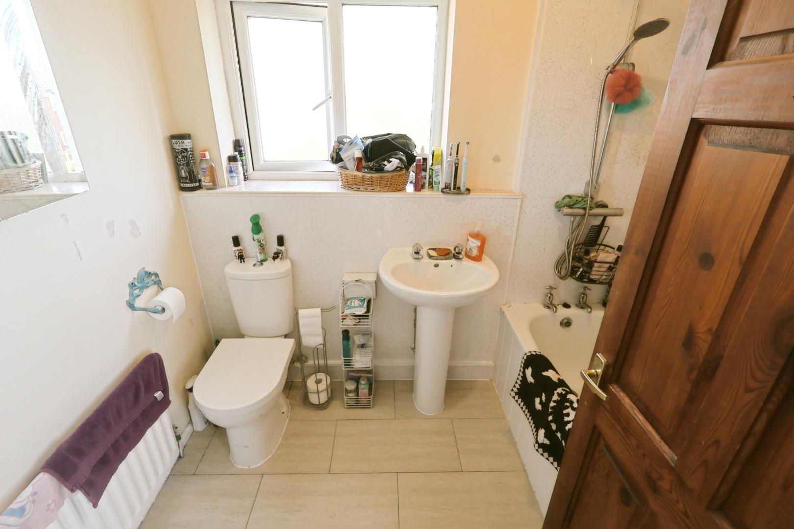 Fitted with a three-piece suite comprising panelled bath with thermostatic shower over, low-level WC, and pedestal wash hand basin. Part tiled and panelled walls, ceramic tiled floor, radiator, and opaque window to rear.
