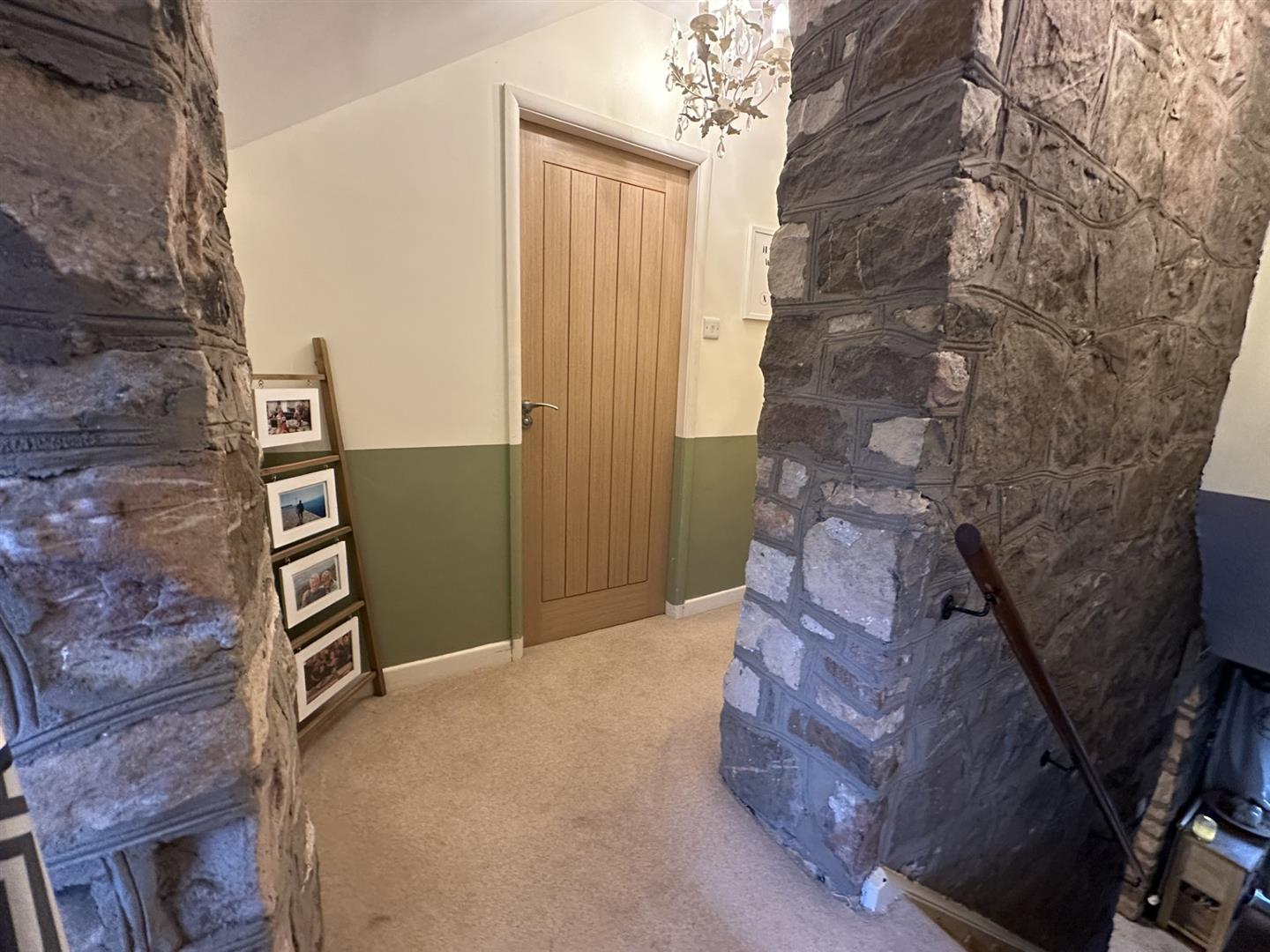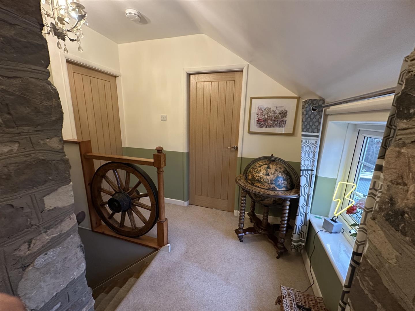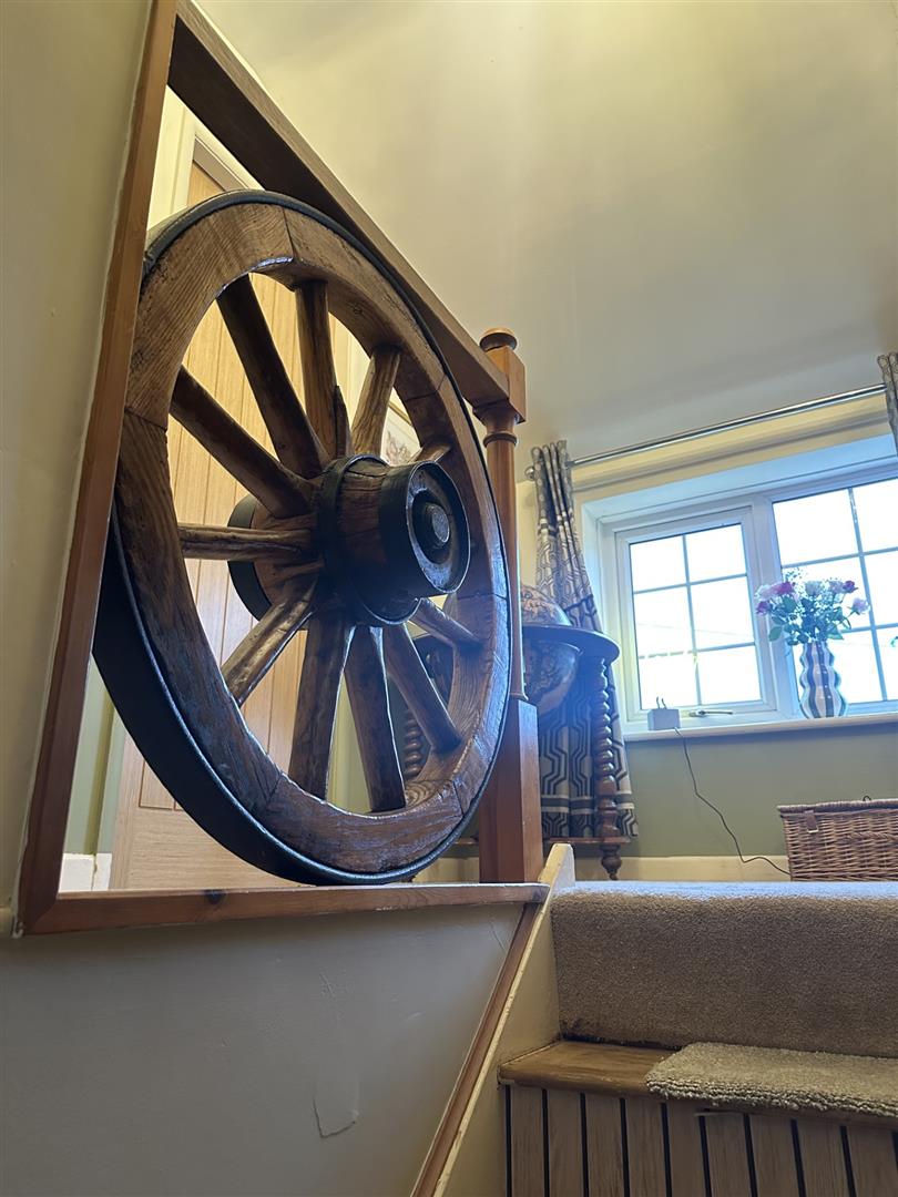 Having a banister with a feature cart wheel, exposed stone work and access to the loft space. Door lead to the bedrooms and bathroom.
