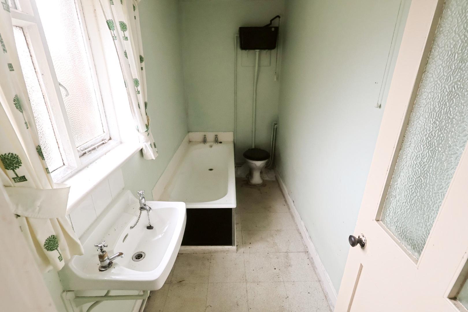 Featuring an opaque single-glazed window to the side elevation, a high-level WC, a panelled bath, and a wash basin.