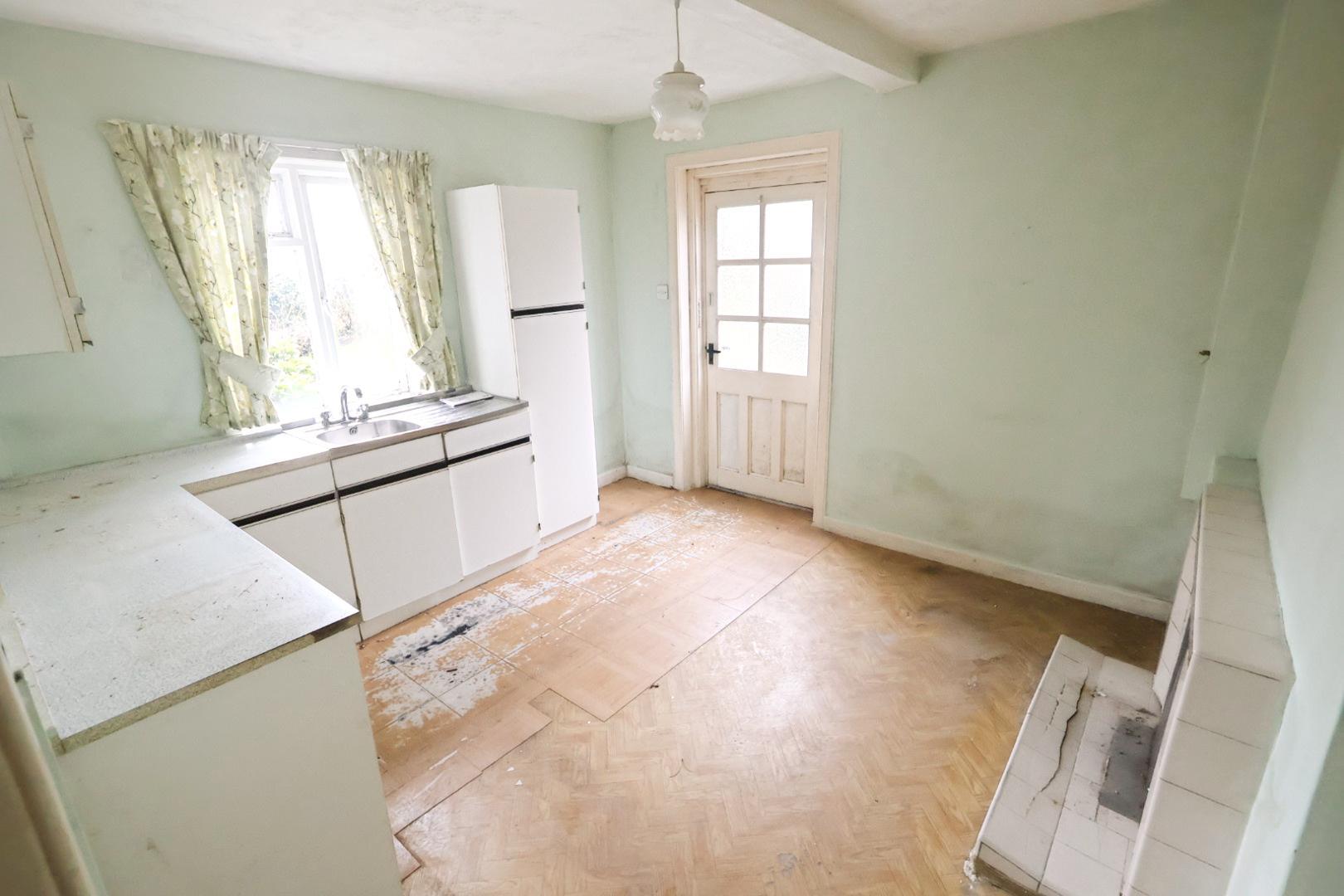 Fitted with a range of wall and base units with work surface space, incorporating a stainless-steel single drainer sink unit with mixer tap. The kitchen also features a ceramic tiled fireplace, a single-glazed window to the side elevation, and an opaque single-glazed door opening to the rear garden.