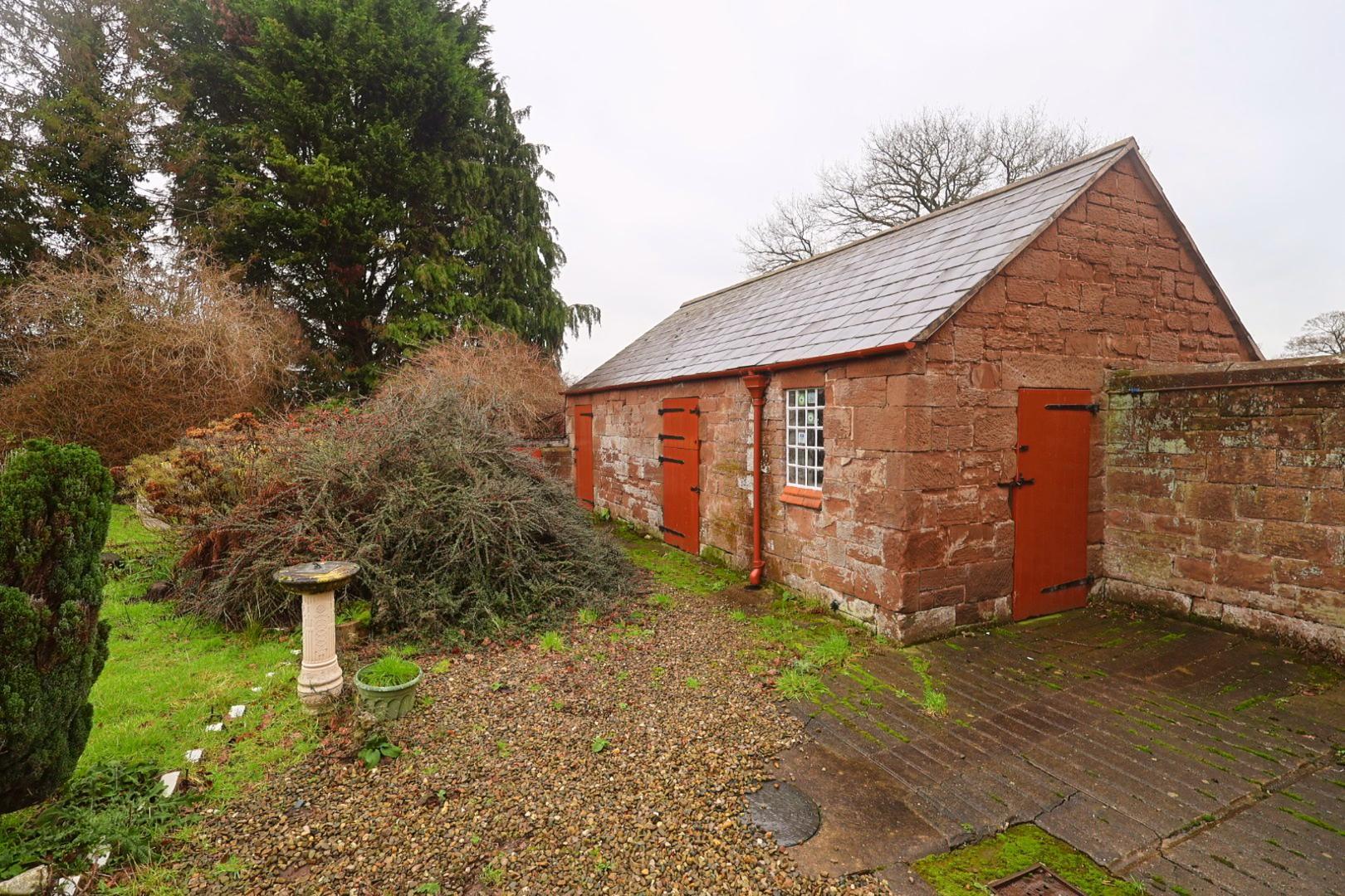 To the rear of the property are sandstone outbuildings divided into three sections: