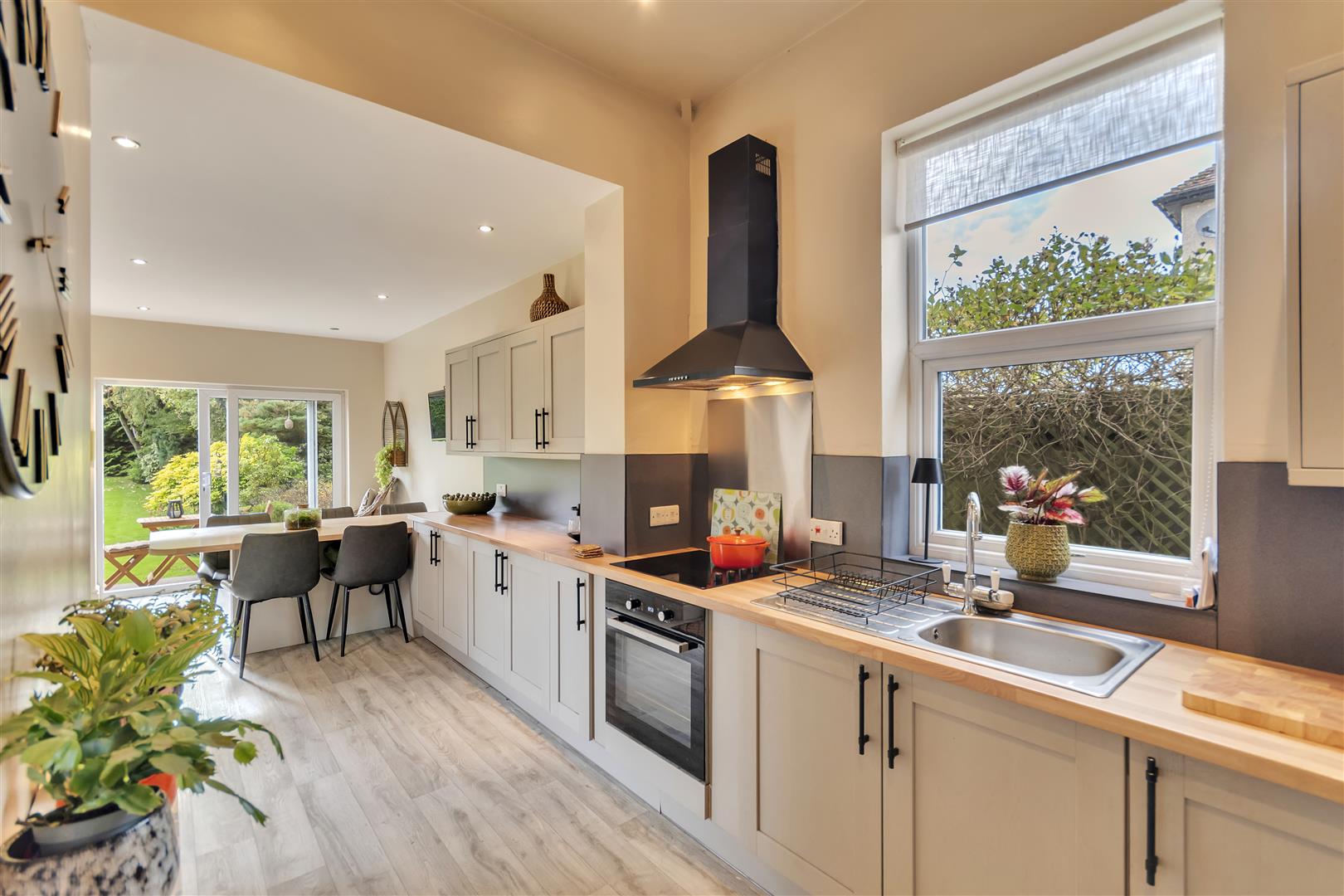 Open plan Kitchen/Dining room comprising a modern range of floor and wall mounted units with worktop over, single sink and drainer with mixer tap over, integrated oven/grill and an inset induction hob with 4 rings and extractor hood over. Integrated fridge/freezer and window to the side. A Peninsular divide with work surface over providing seating area and silding doors to the rear garden and a door to the side also into the garden. Grey wooden effect flooring and radiator.