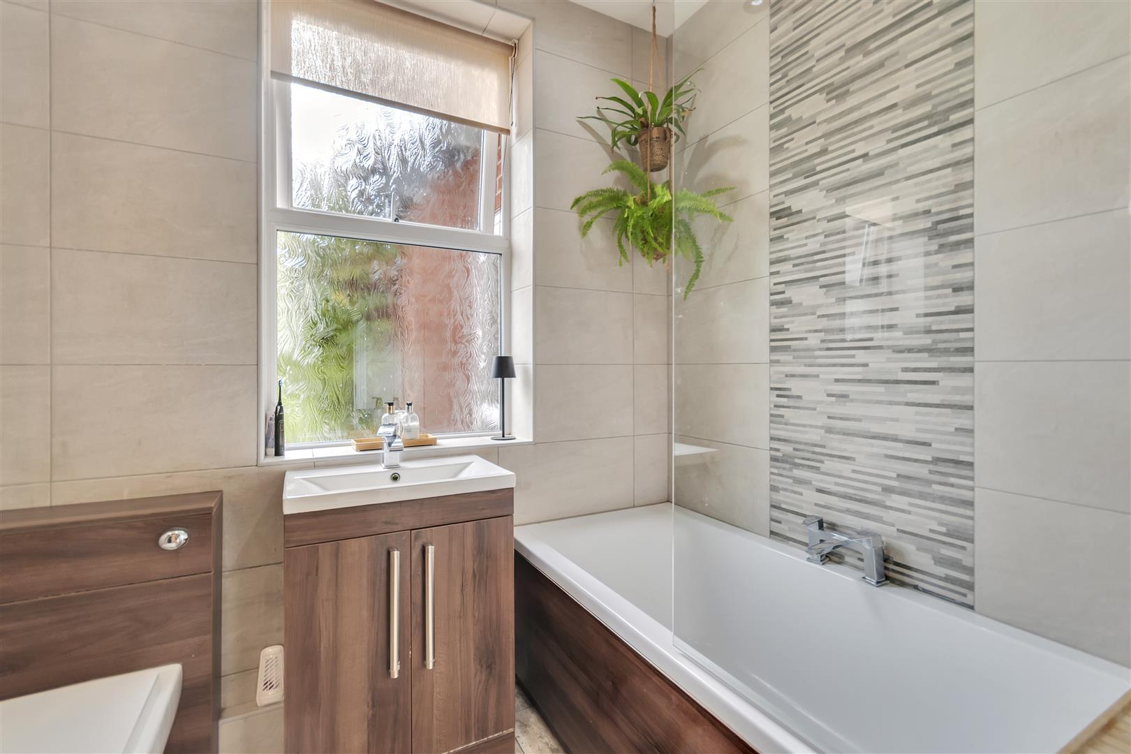 Modern bathroom suite comprising a panelled bath with shower attachment over, WC and wash hand basin with vanity unit below. Fully tiled walls anbd tiled flooring. Window to the rear and spotlights to the ceiling. Heated towel rail.