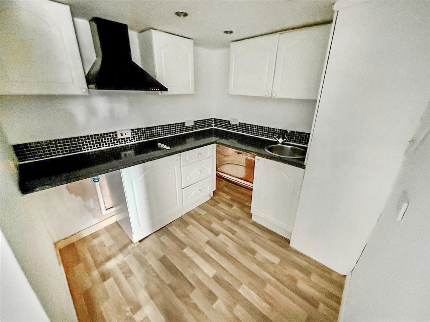 With wood effect vinyl flooring, fitted base and wall units with work surfaces over, a sink with mixer tap, space for a fridge and freezer, space for a washing machine, electric hob with extractor fan over and spotlighting.