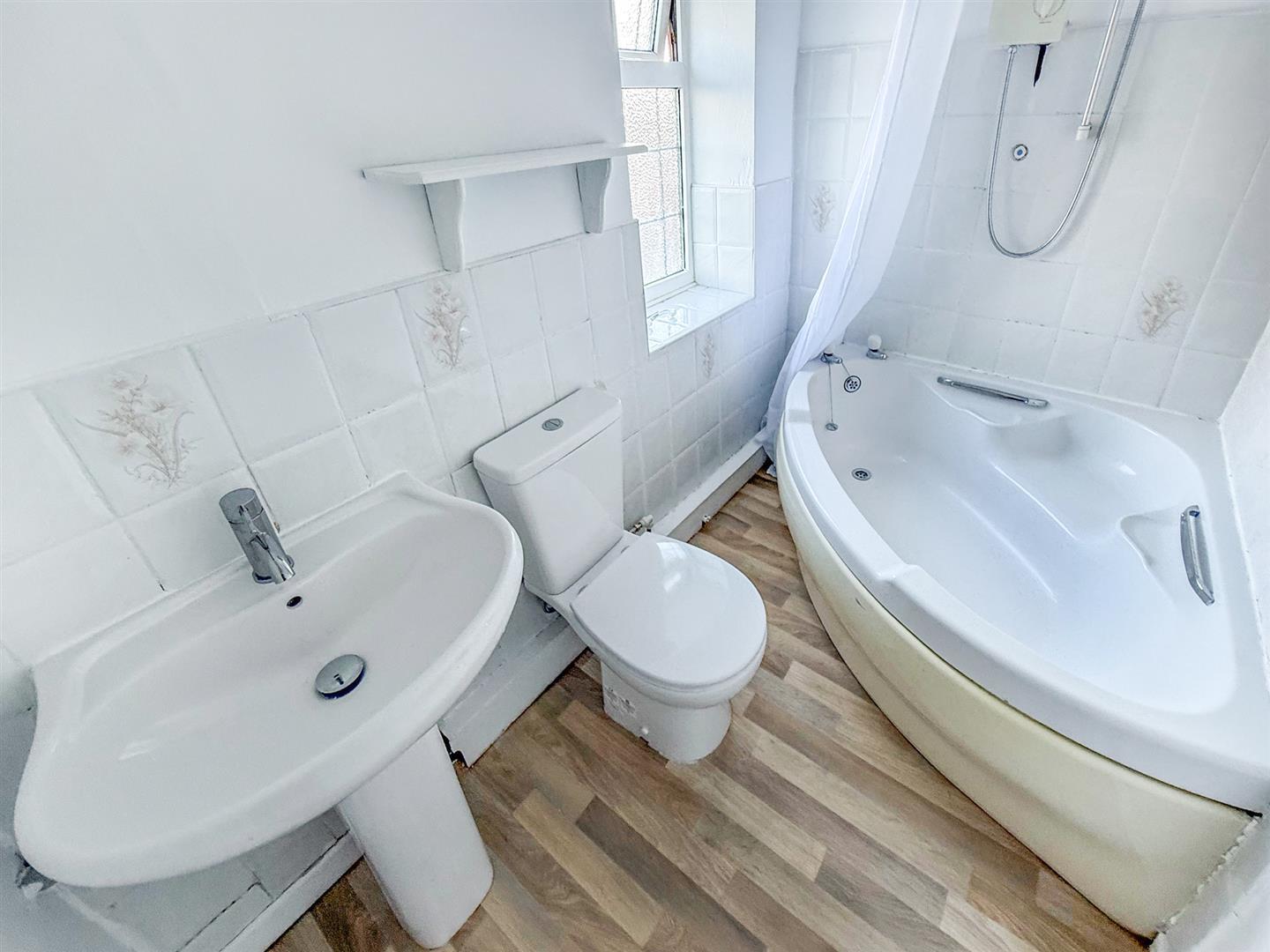 With a wash hand basin with mixer tap, WC, corner panelled bath with an electric shower over, a window to the rear, part tiled walls and vinyl wood effect flooring.