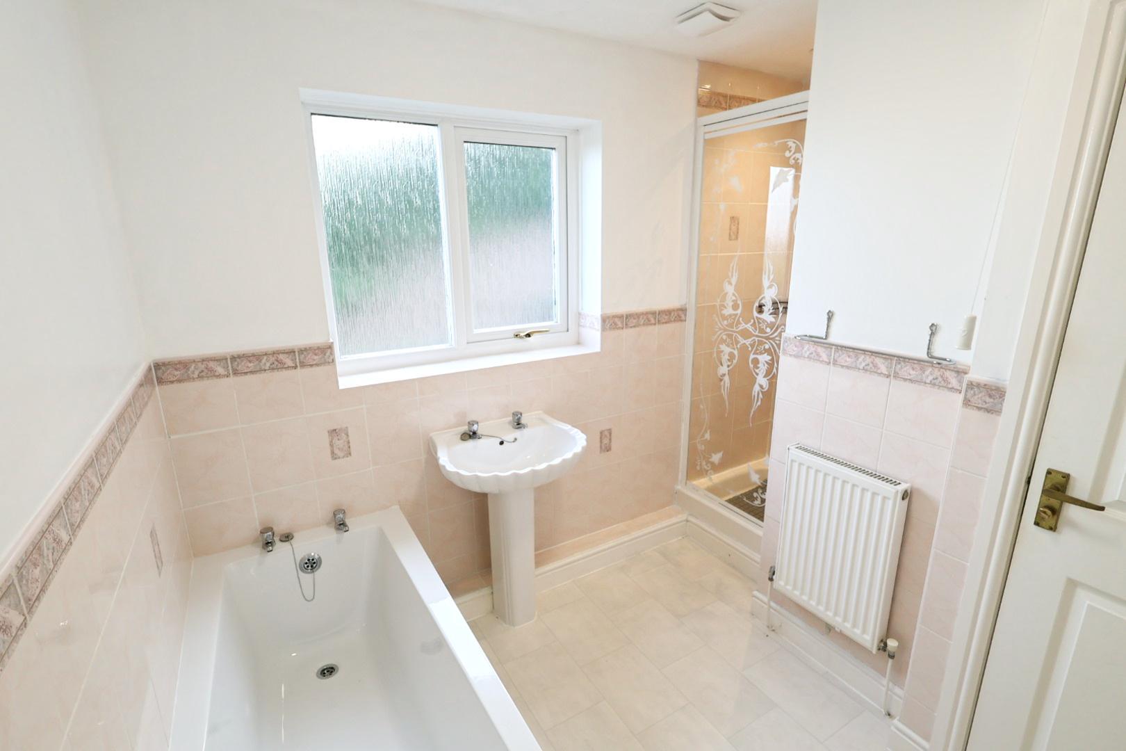 Fitted with a white four-piece suite comprising a panel bath, separate shower enclosure with thermostatic shower, low-level WC, and pedestal wash hand basin. The walls are partially tiled, and there is a radiator, opaque rear window, and extractor fan.