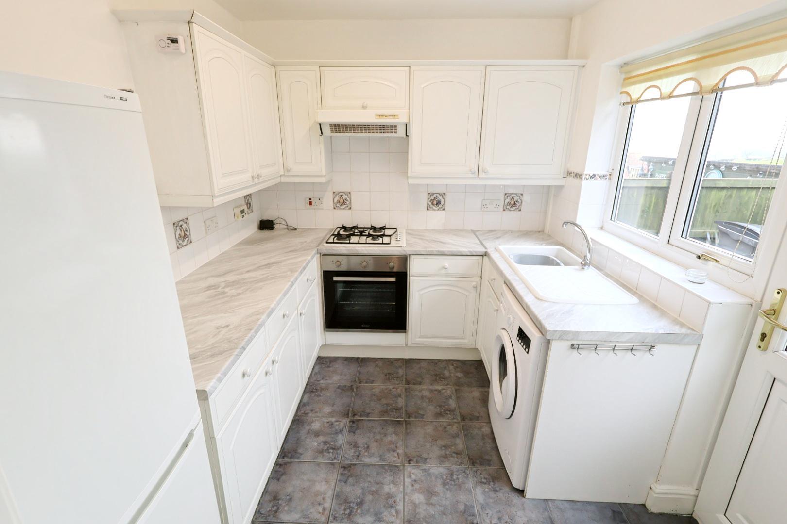 Fitted with a range of white wall, base, and drawer units with work surface space, incorporating a stainless steel single drainer sink unit with mixer tap and tiled splashbacks. Integrated appliances include a stainless steel oven with hob and extractor hood above. There is space for a tall fridge/freezer and plumbing for a washing machine. The kitchen also features a ceramic tiled floor, radiator, rear-facing window, and a UPVC double-glazed door opening to the garden.