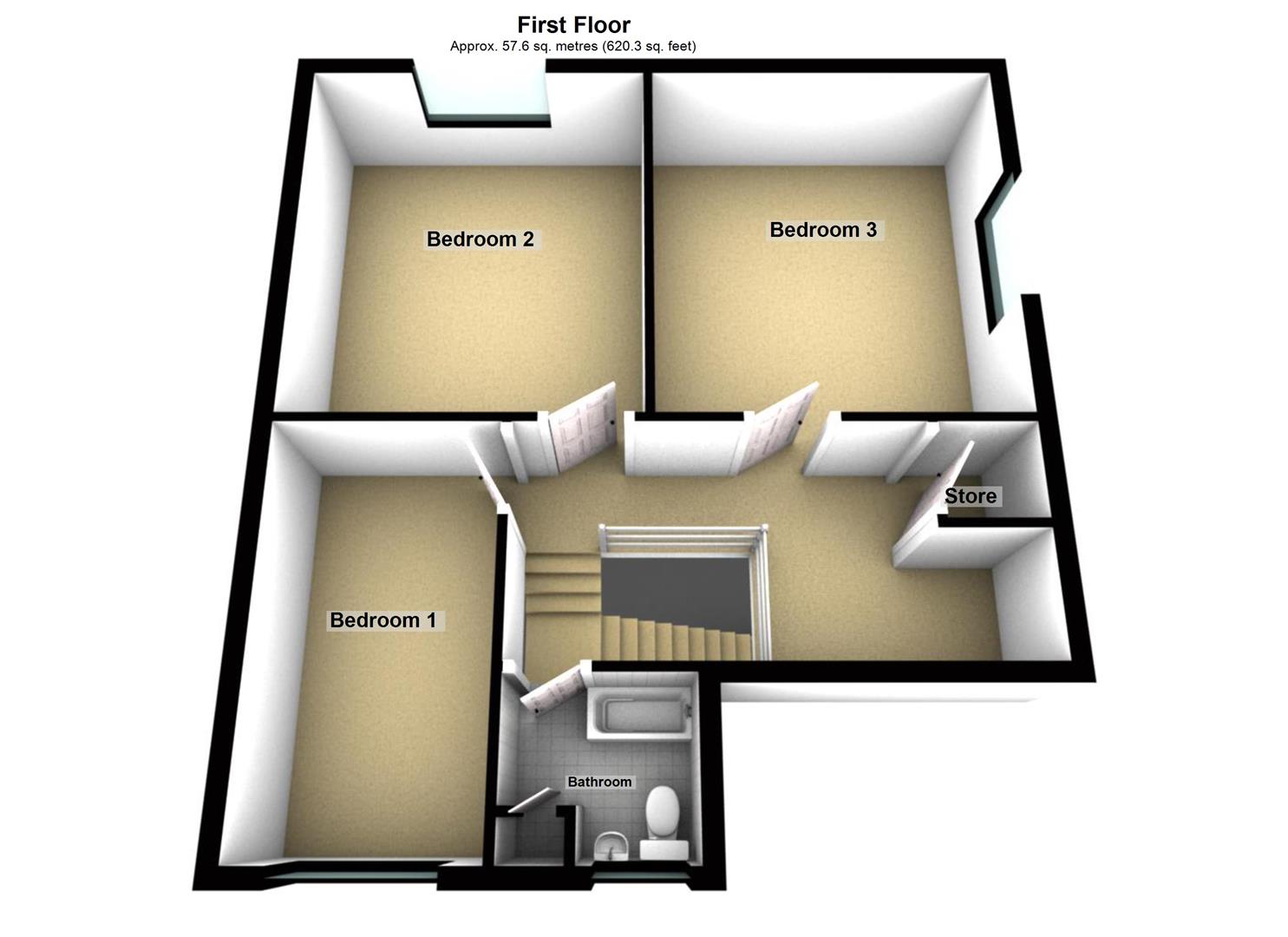 The staircase features a continuation of the banister and spindle balustrades from the entrance hall, leading to a landing with a high-level window to the side elevation. Doors from the landing open to the bathroom, all three bedrooms, and a walk-in store."