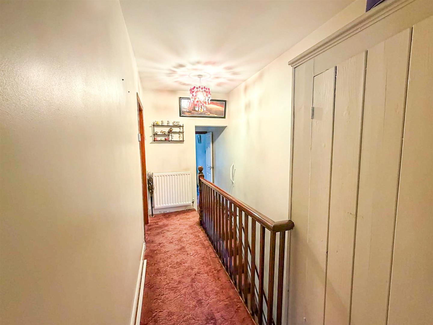 A traditional landing with spindled balustrade, doors leading to the bedrooms and bathroom. There is access to the roof space via a loft hatch and a linen cupboard with shelving.