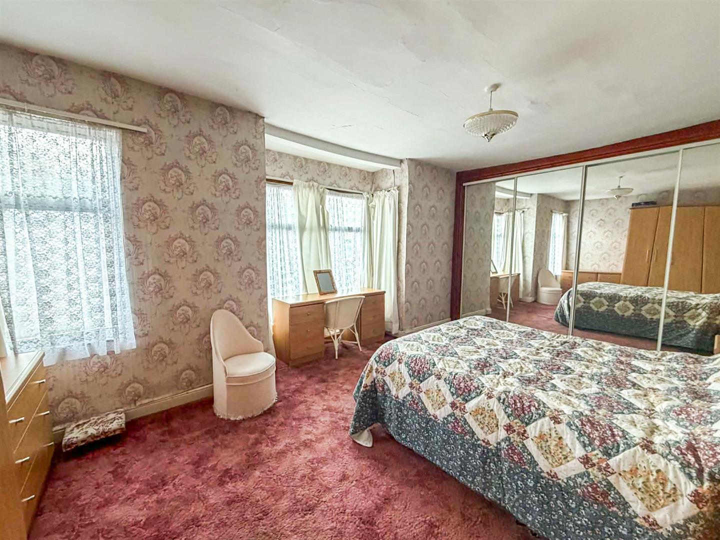 A fantastic large bedroom with a large square bay window to the front and a further window to the front, large mirrored wardrobe and a radiator.