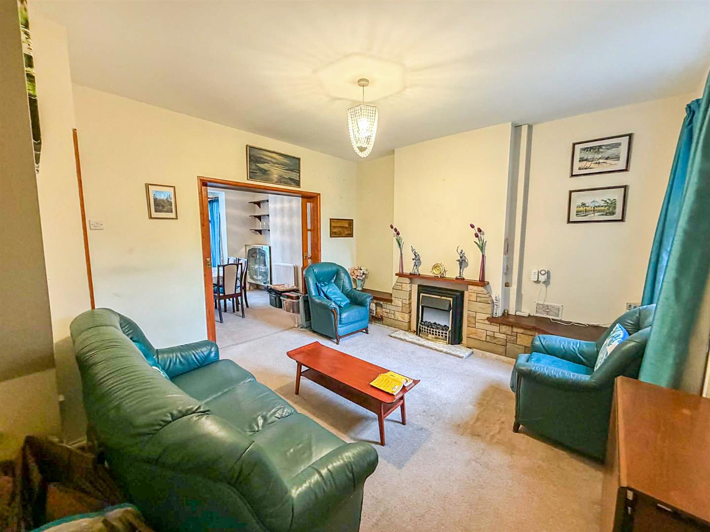 With a window to the rear and sliding double doors to the dining room, the spacious lounge has a brick feature fireplace with display shelving and a gas fire, radiator and a door to the kitchen.