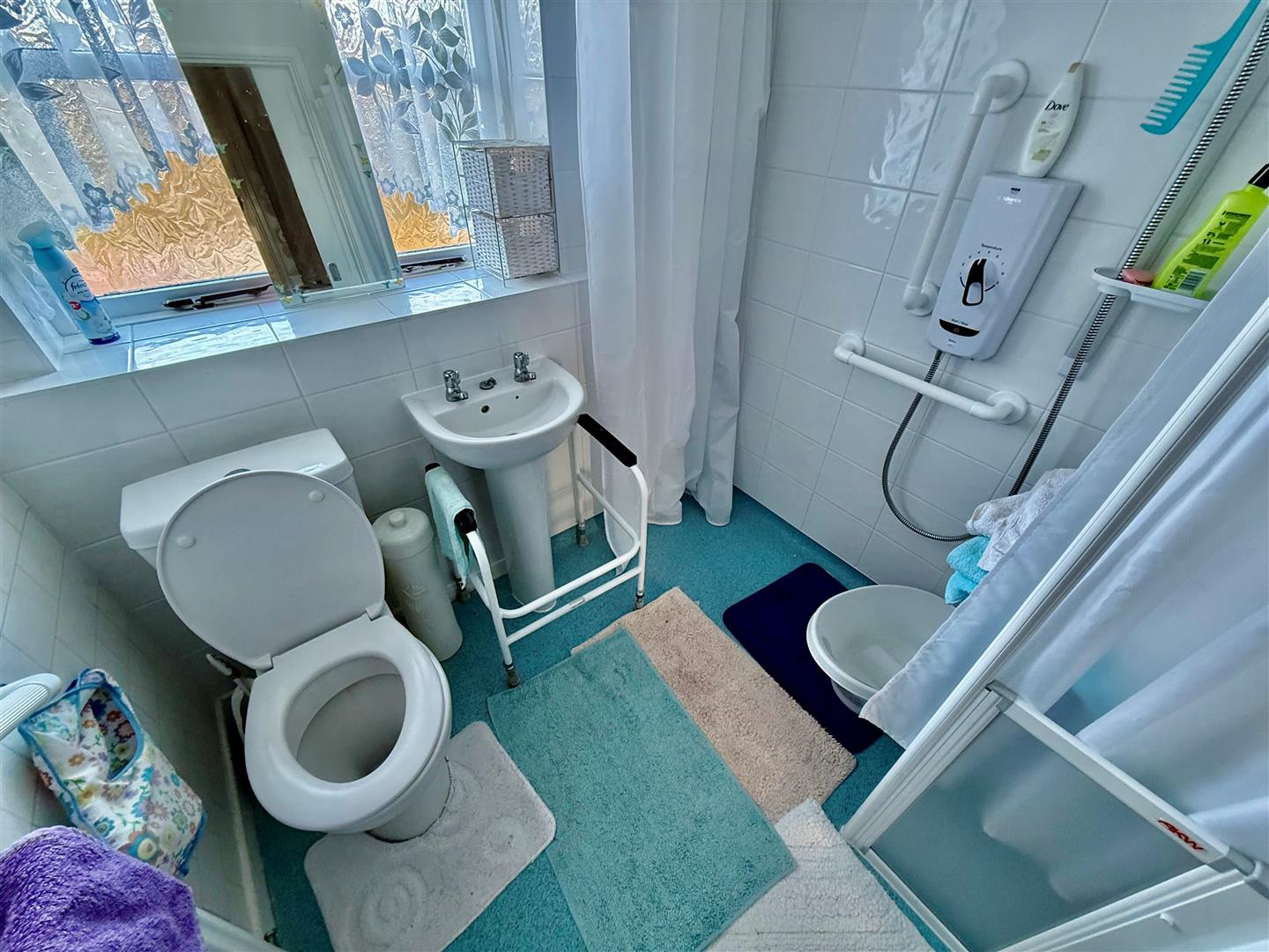 The wet room comprises WC, wash hand basin and a sealed floor with Mira electric shower. Fully tiled walls, radiator and extractor fan.